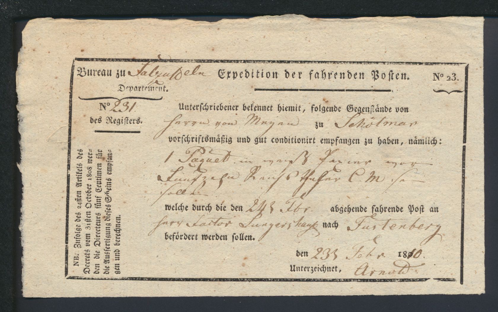 1809 bevor die kgl. westphälische Post eigene Postscheine ausgab, welche in Form und Text erheblich von der preußischen Art unterschieden. Aufgrund des kaiserlichen Dekrets vom 13.12.1810 mußte das KönigreichWestphalen den größten Teil seines Weser - Departments (mit der Stdt Minden) an Frankreich abtreten, welches daraus das Department Nr. 130 "L'Ems superieur" bildete. Da die französiche Post keine staatliche Fahrpost unterhilet, sie vielmehr privaten Unternehmen überliß gibt es aus dieser Zeit keine staatlichen Fahrpostscheine. Stichwort Postsache.