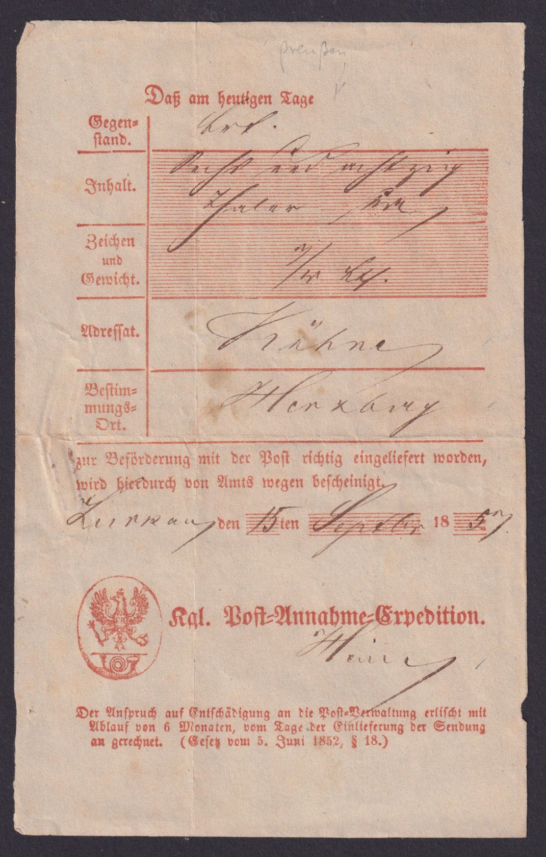 Altdeutschland Preussen Postschein Kgl. Post Annahme Expedition Luckau an Kühne