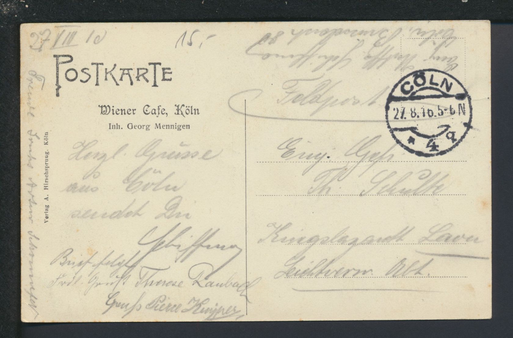 Ansichtskarte Köln Cöln NRW Wiener Cafe seltene Innenaufnahme Feldpost 1916