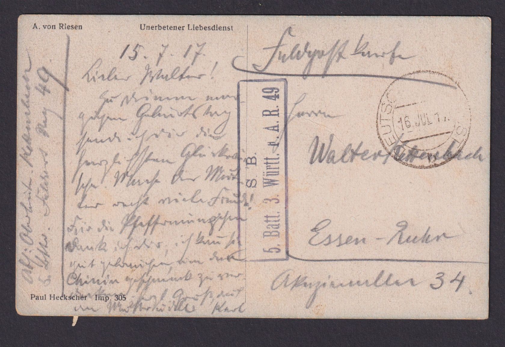 Bad Feldpost n. Essen Ruhr NRW 16.07.1917