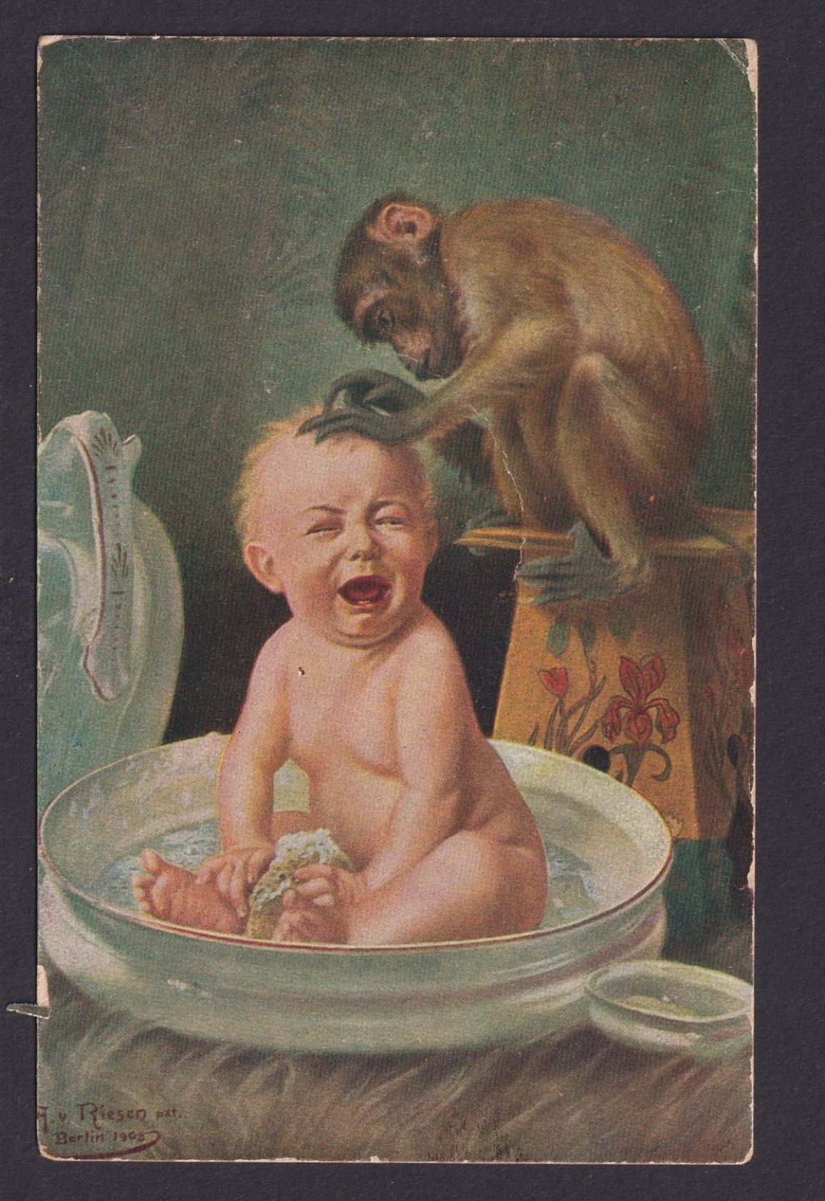 Ansichtskarte Künstlerkarte Scherzkarte Humor Sign. Riesen Junge und Affe beim