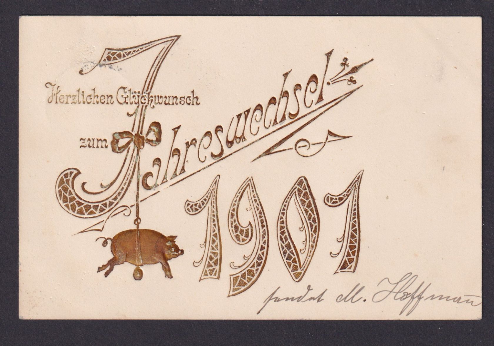 31.12.1900 Reichspost. 1901 Sehr aufwendige und außergewöhnlich schöne Künstler Prägekarte und mit Golddruck.