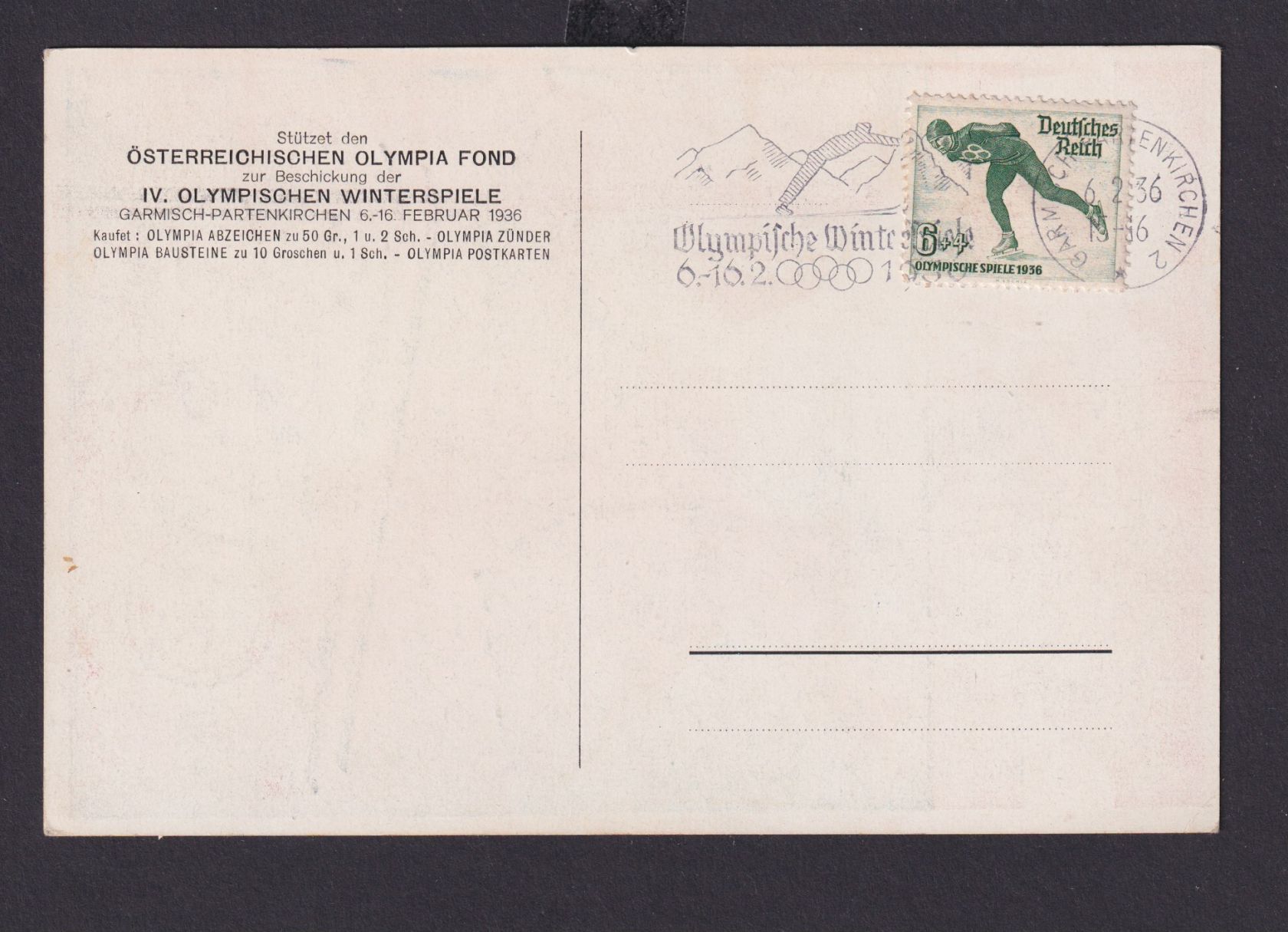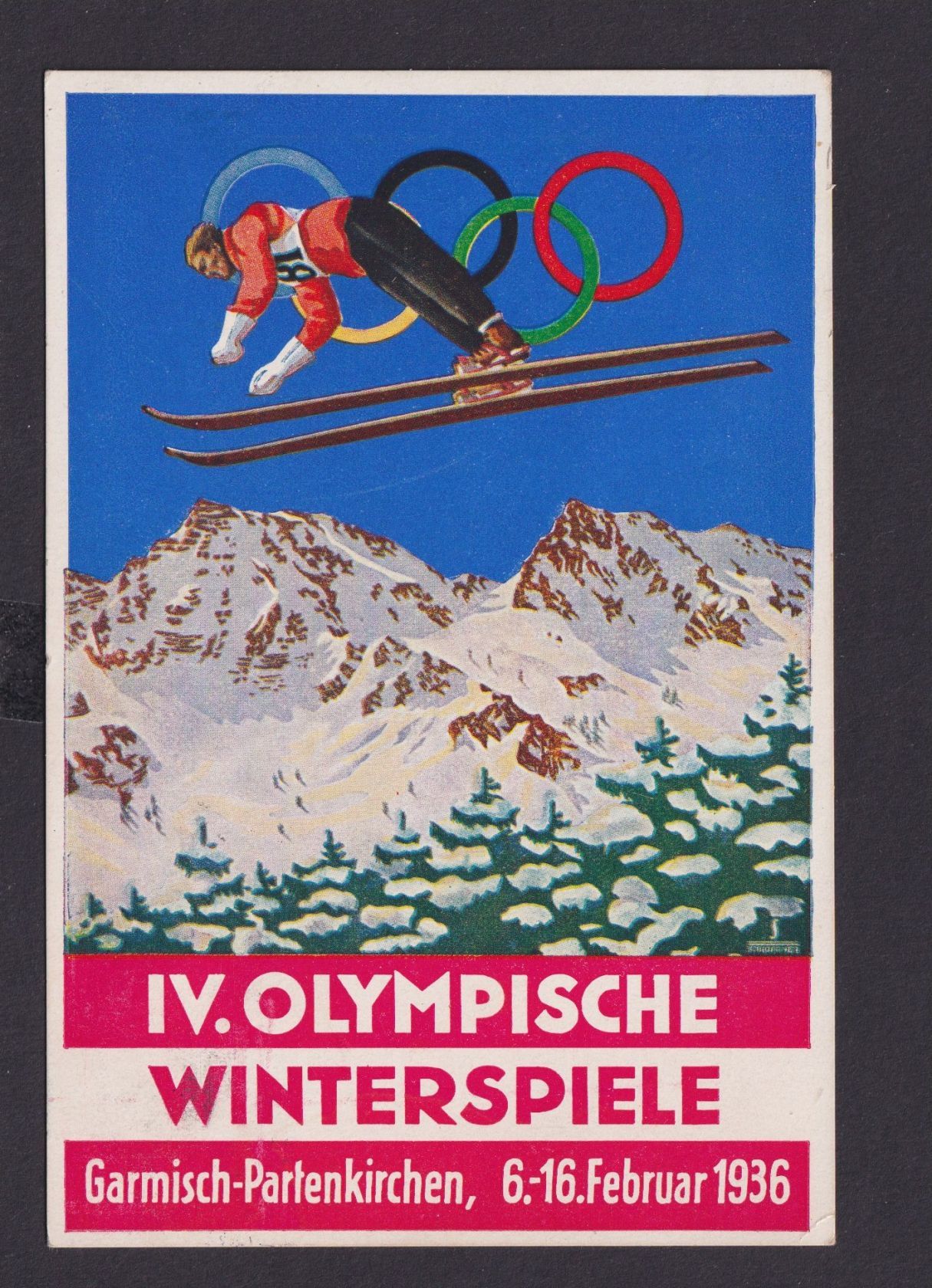 Winterspiele 1936 Olympische Ringe Bergpanorama 06.02.1936 Deutsches Reich. Immer gesuchte Art Deko Anlasskarte der 30er Jahre mit selt. Maschinen - Sonderstemepl.