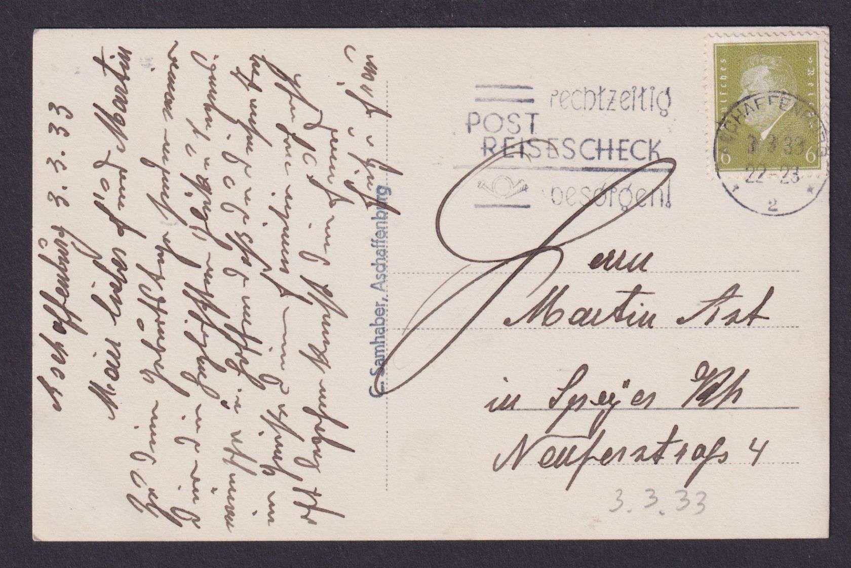 Post Reisescheck besorgen n. Speyer Rheinland Pfalz 03.03.1933 AK Aschafenburg Schloss, Schnapszahl