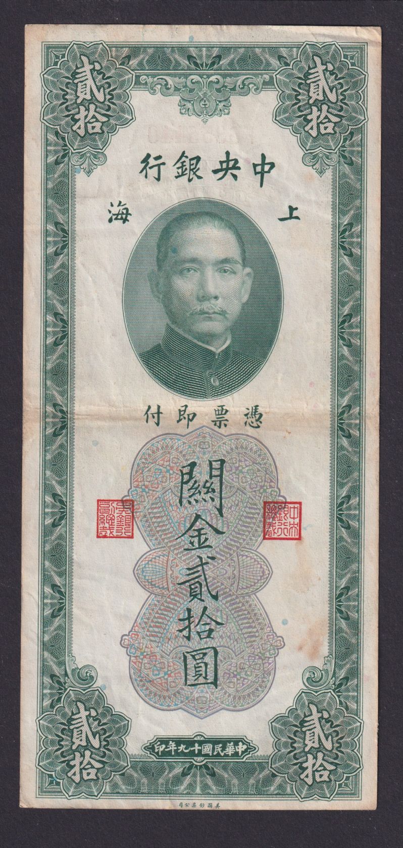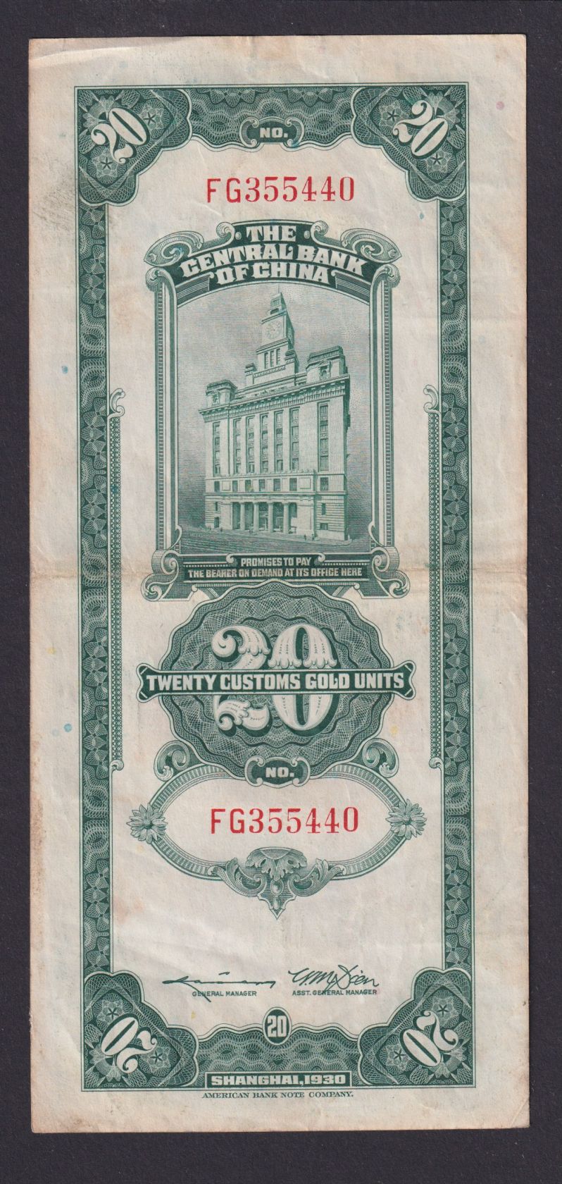 Banknote Geldschein China Asien Shanghai 20 CGU Customs Gol Units 1930