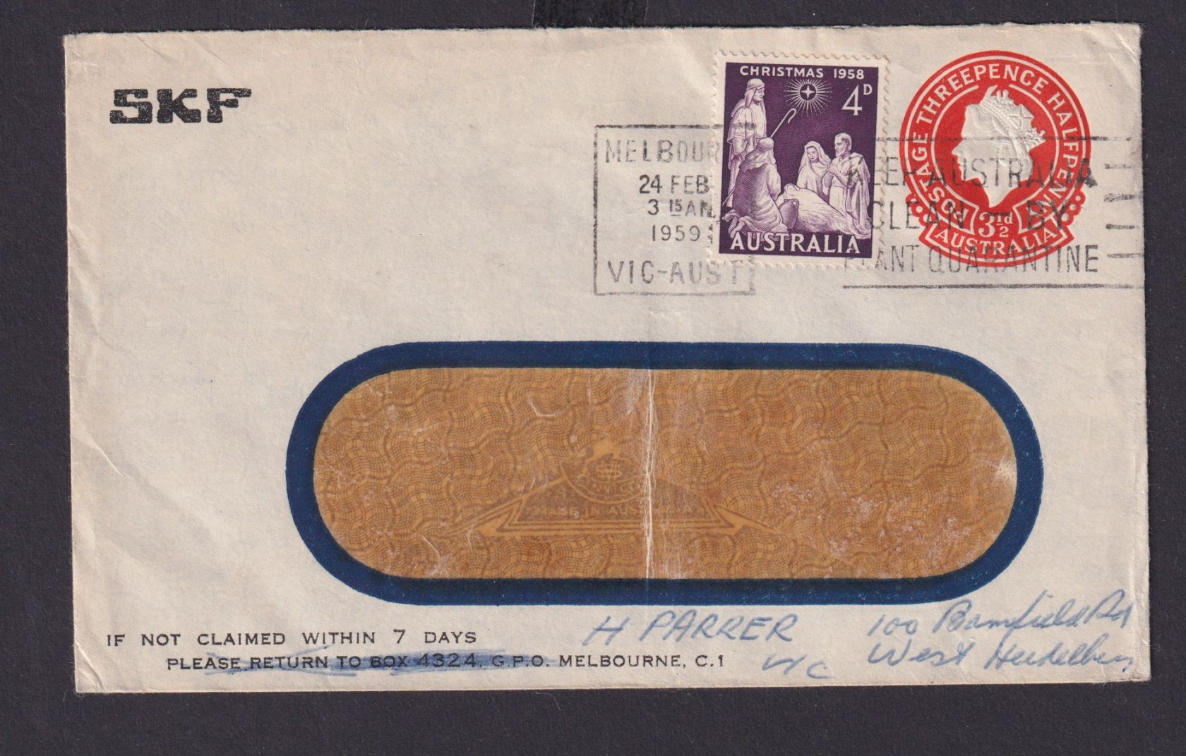 Melbourne Victoria Maschinen Stempel Keep Australia clean plant Quarantine nach Bamfield 24.2.1959. Der Umschlag wurde gefaltet.