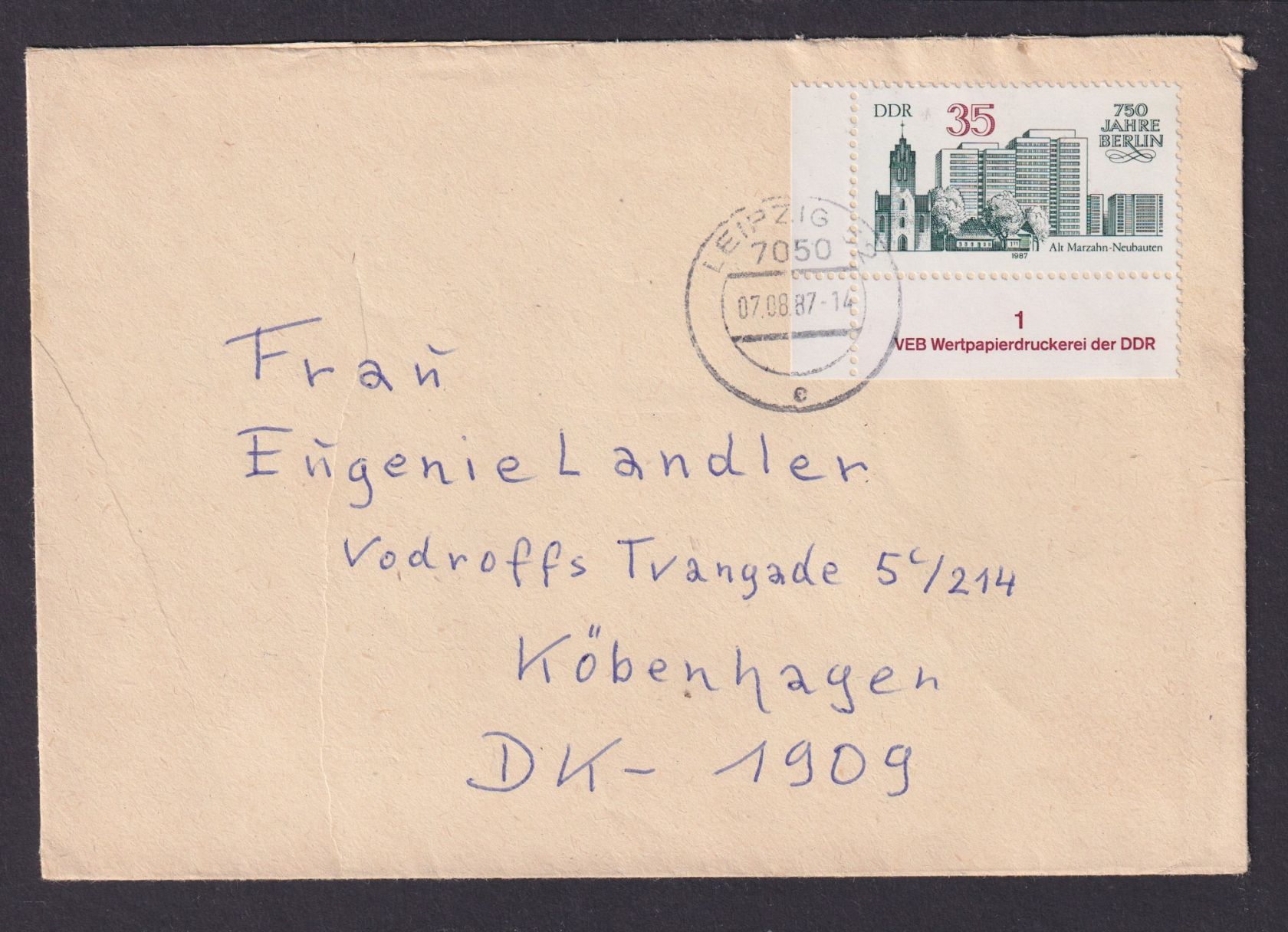 Briefmarken Bogenecke Eckrand DDR Brief mit Druckereiangabe Leipzuig Kopenhagen