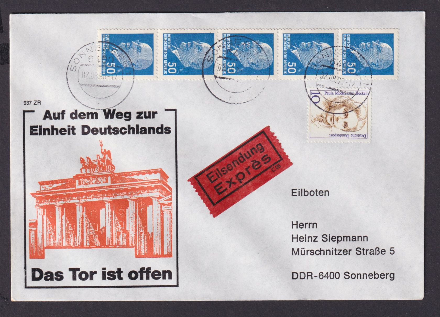 Briefmarken DDR Brief Einheit Deutschland Berlin Brandenburger Tor ab Sonneberg