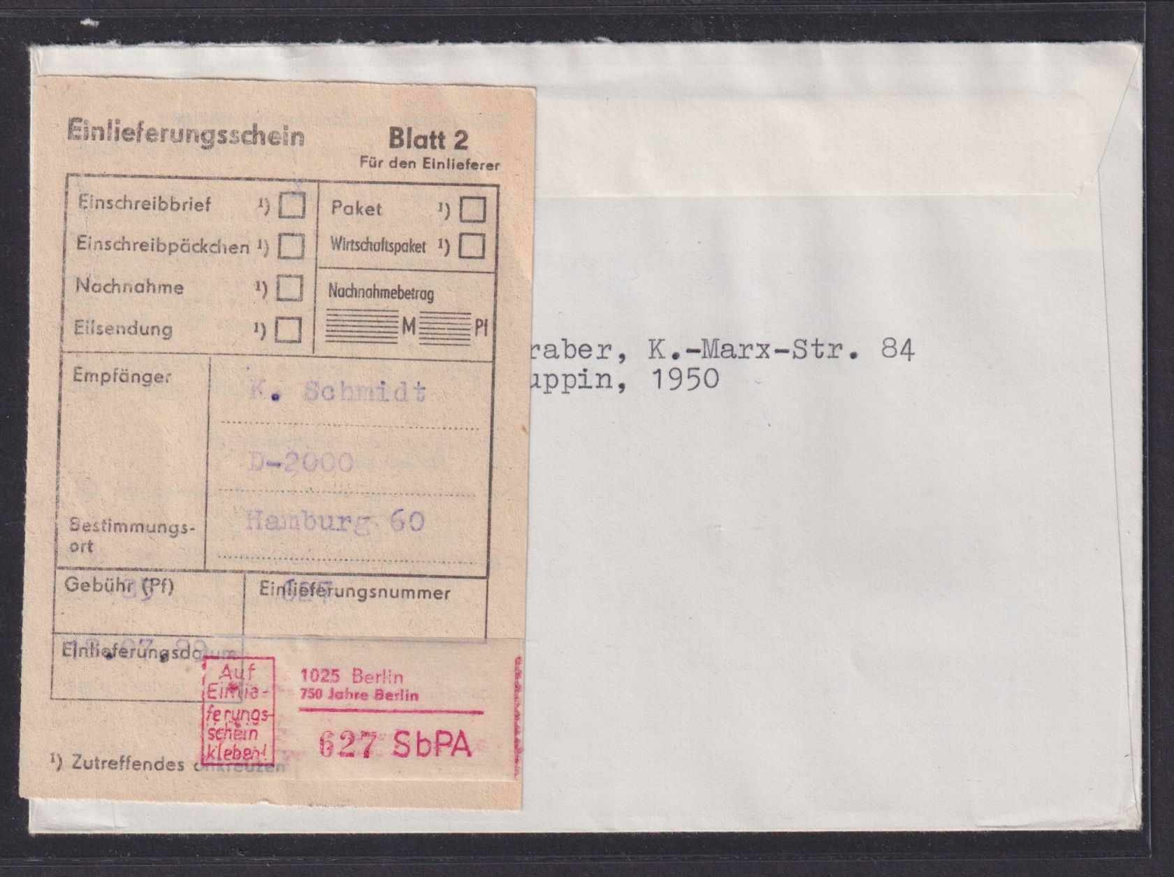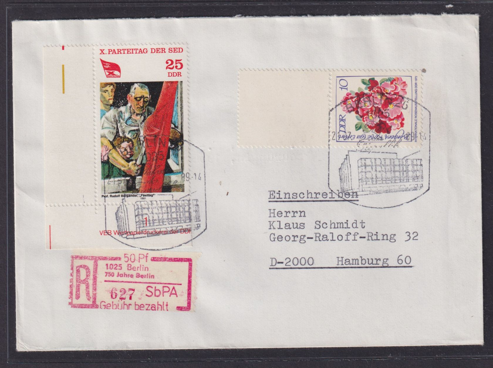 So-der Einschreibemarke Berlin 750 Jahre mit entsprechender nach Hamburg 21.7.1989. Alles gerechnet ein außerordentlicher Beleg!