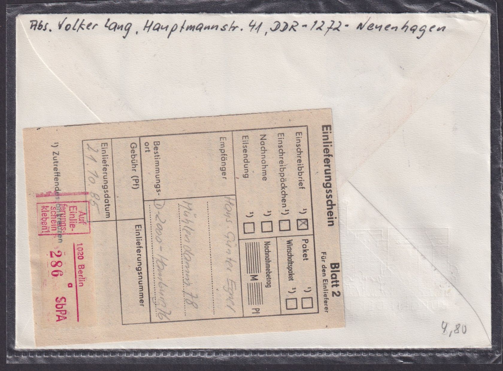 DDR Brief Einschreibemarke 50 Pf SST Berlin Burgen Hamburg + Einlieferungszettel