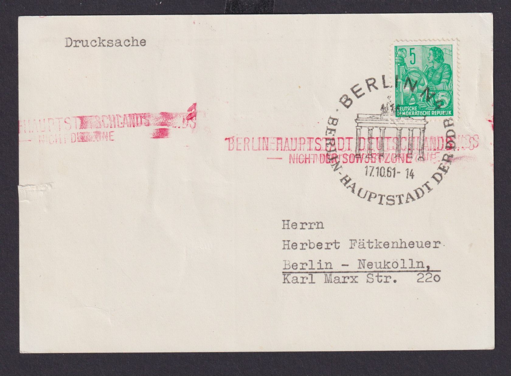 DDR Brief inter. Stempel Brandenburger Tor +roter....nicht der Sowjetzone auf Pk