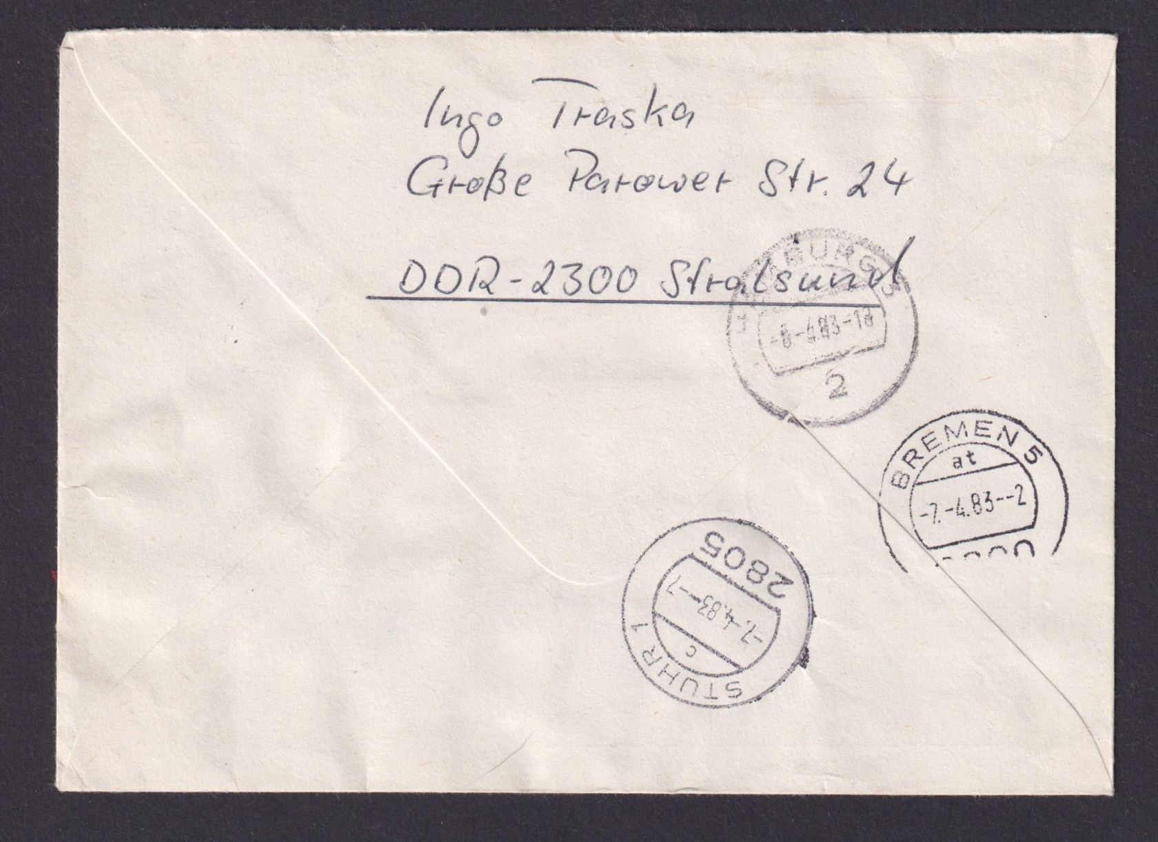 DDR Eilboten Brief 2557 Zusammendruck Viererblock Stralsund Stuhr Farbstreifen