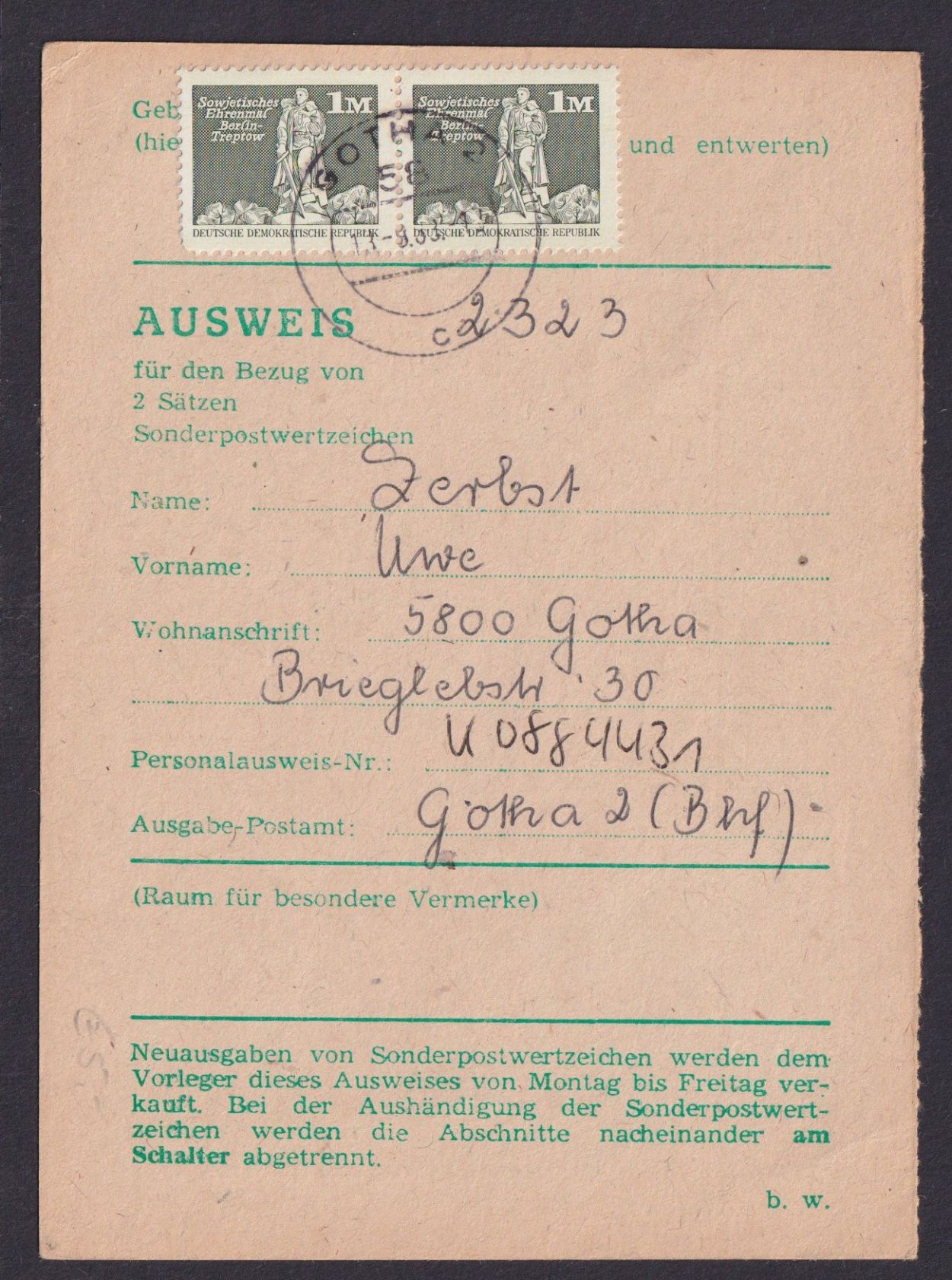 DDR Ostalgie Ausweis MEF 1 Mark Aufbau Bezug Sonderpostwertzeichen DDR Gotha