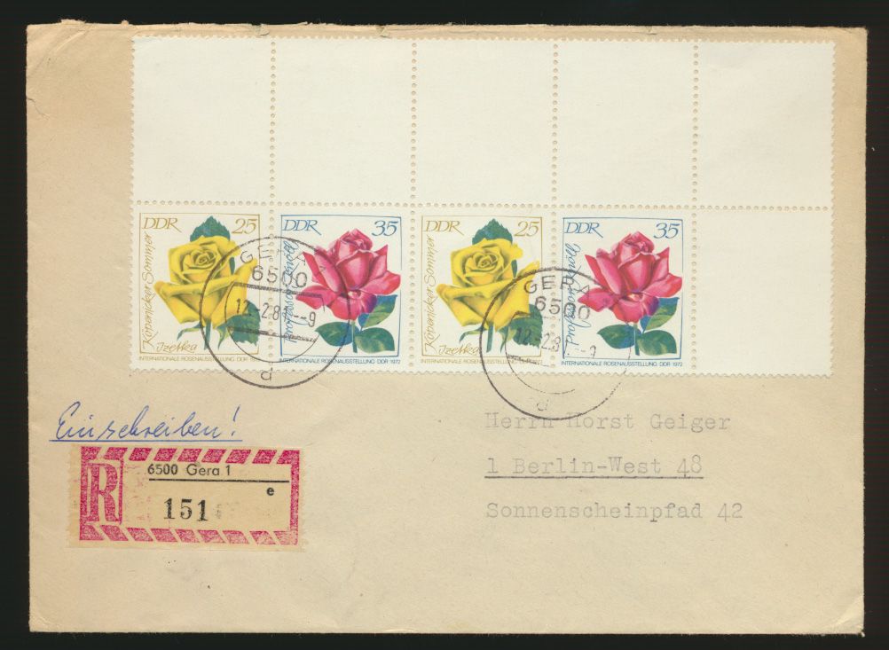 DDR R Brief Zusammendruck Rosen Bogenecke Eckrand 6 gezähnte Leerfelder Gera n.