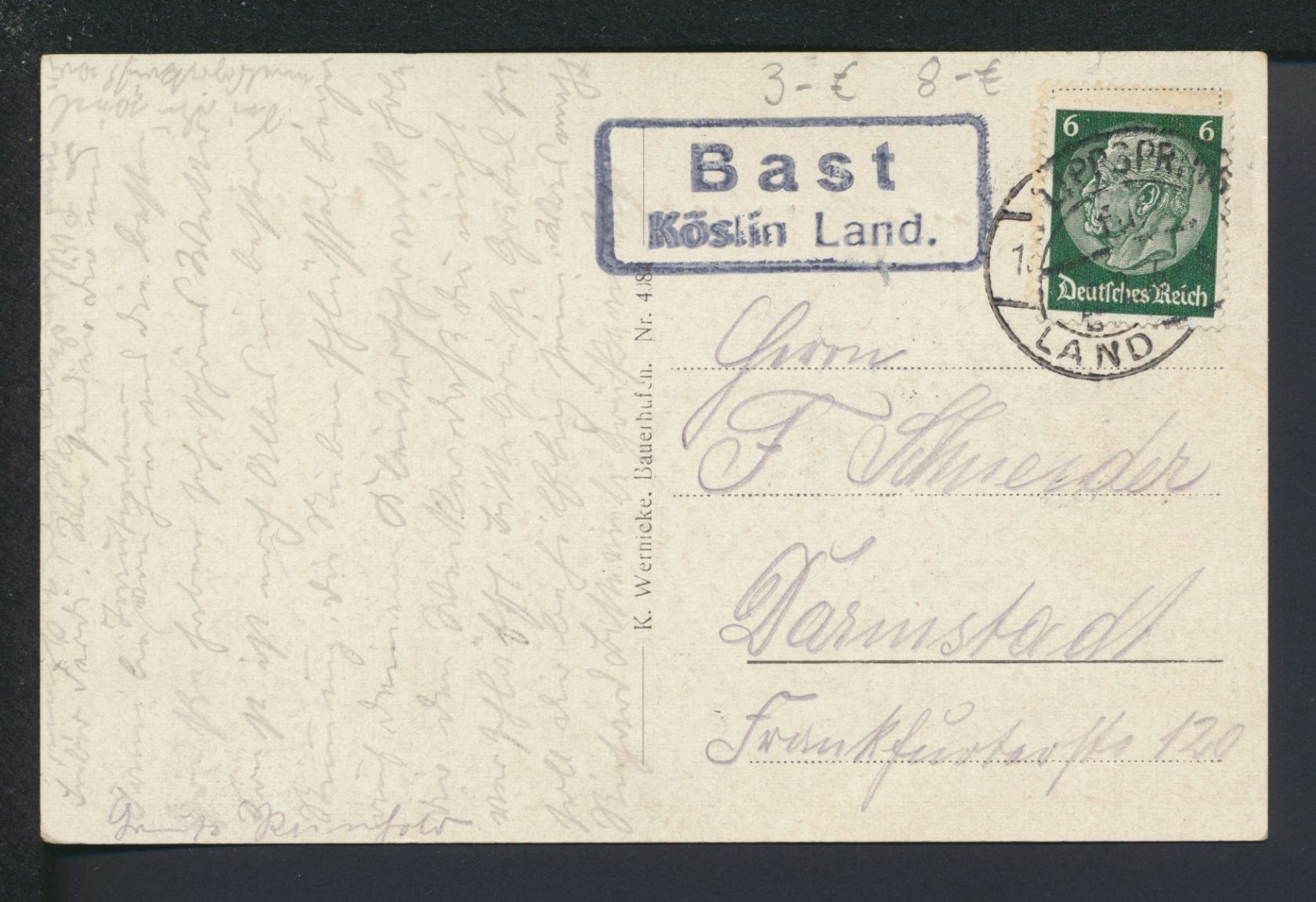 Deutsches Reich Bast über Köslin Pommern Ostgebiete Polen Landpoststempel