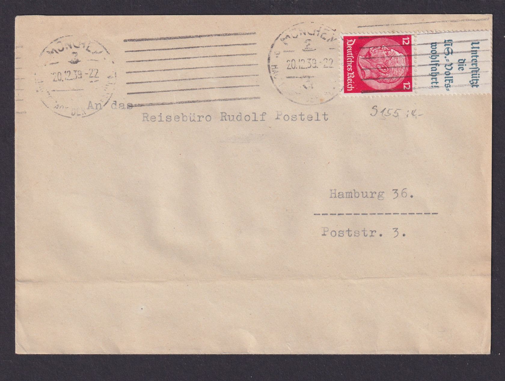 Deutsches Reich Brief Zusammendruck Hindenburg München Hamburg 20.12.1939