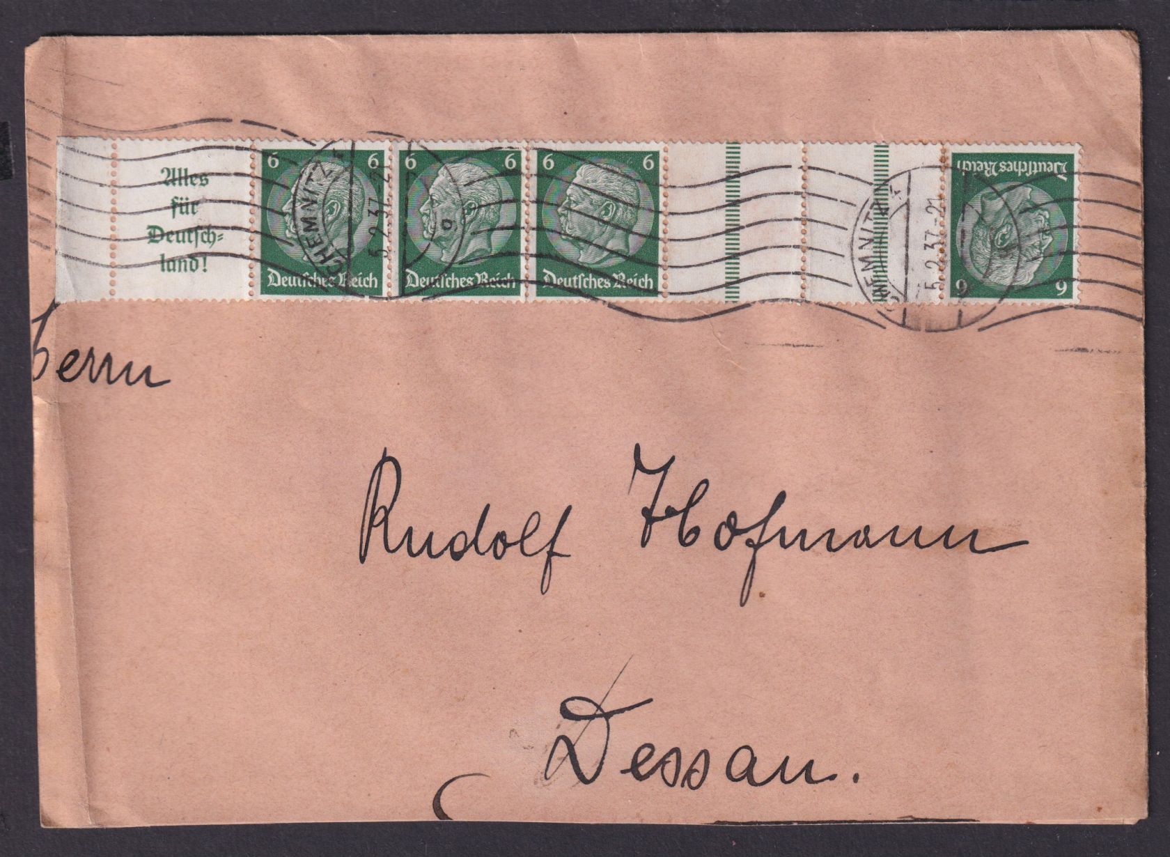 Deutsches Reich Briefstück Zusammendruck Hindenburg MEF Kehrdruck Chemnitz Dessau