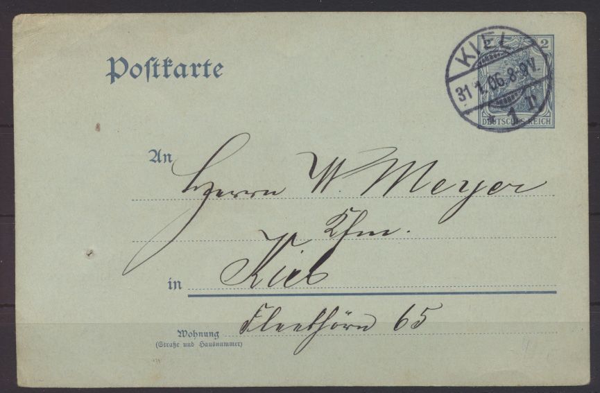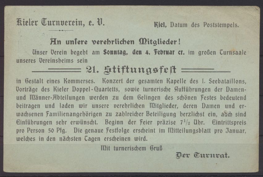 Deutsches Reich Ganzsache P 63 X Zudruck Kiel Turnverein Stiftungsfest 31.1.1906