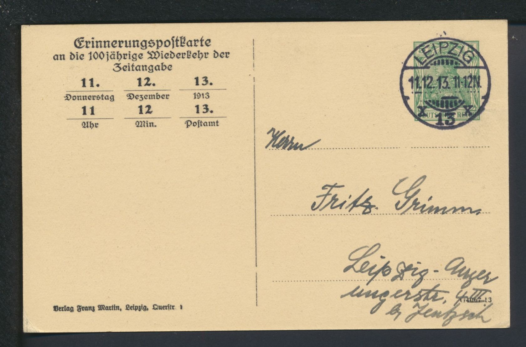 Deutsches Reich Privatganzsache Kalenderblatt in Jugendstil Uhr Leipzig 11.12.13