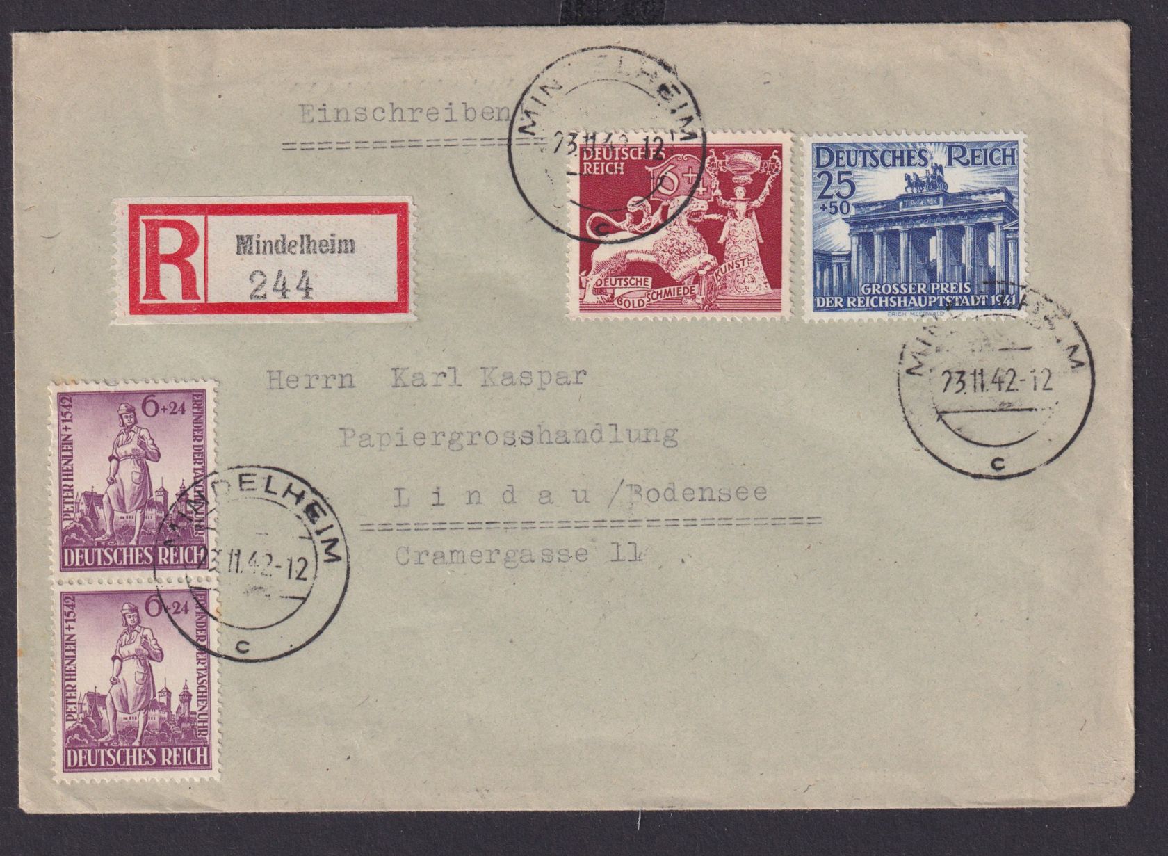 Deutsches Reich R Brief MIF Mindelheim Lindau Motiv Brandenburger Tor 23.11.1942