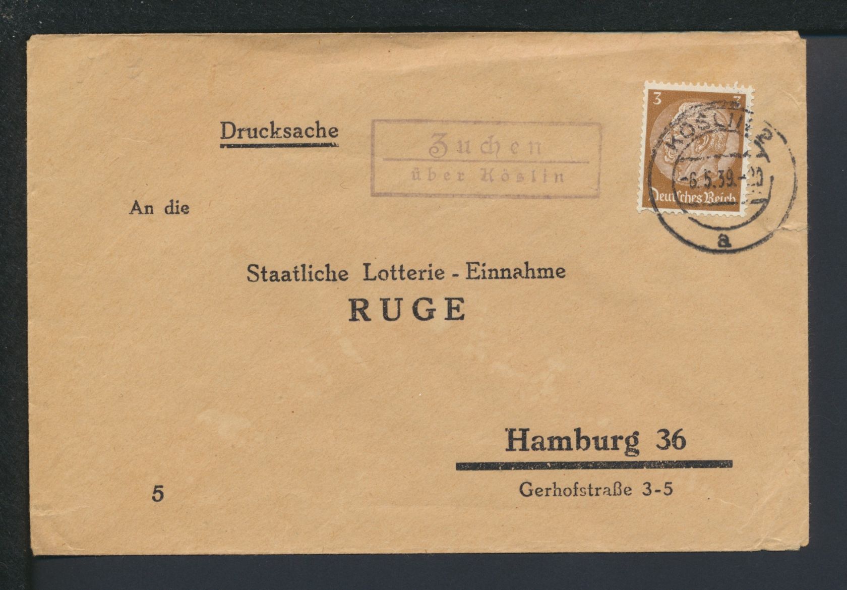 Deutsches Reich Zuchen über Köslin Pommern Ostgebiete Polen Landpoststempel