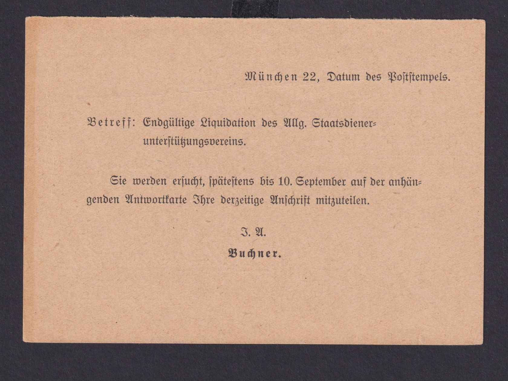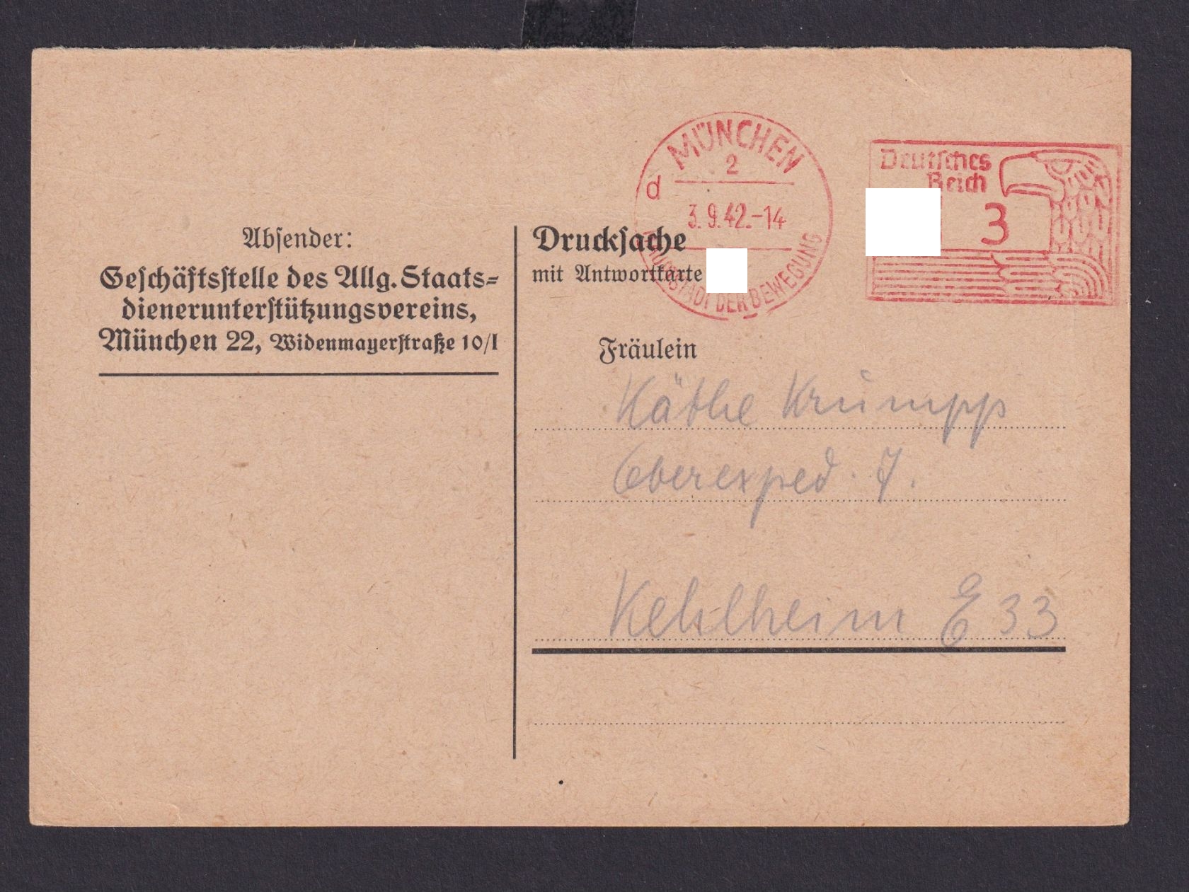 Hauptstadt der Bewegung n. Kehlheim Wertstempel 3 auf Drucksachen Antwortkarte des Allg. Staatsdienerunterstützungsverein bezüglich endgüldige Liquidation des Vereins Widenmayerstraße 10/I 03.09.1942. Interessantes Zeitdukument und Heimatbelg.