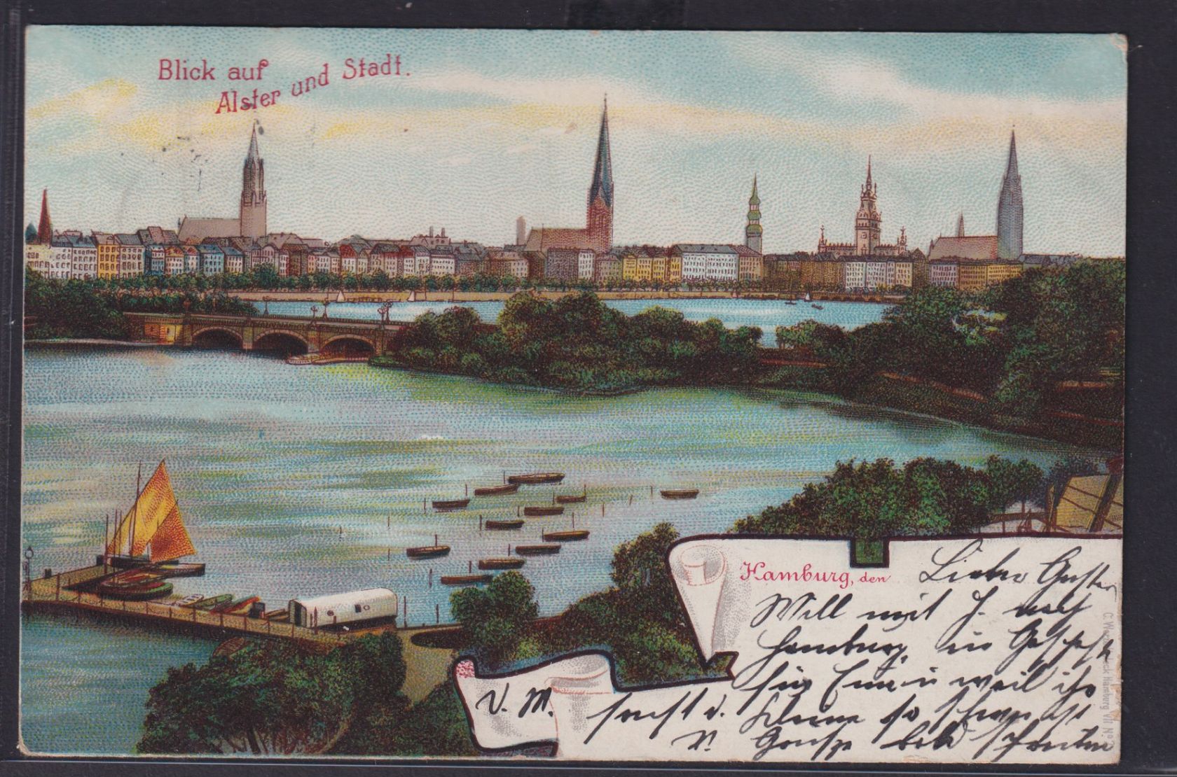 Ansichtskarte Künstlerkarte Hamburg Alster Fluss Brücke Stadt Teilansicht