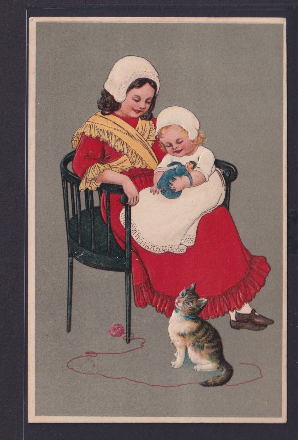 Ansichtskarte Künstlerkarte Prägekarte Frau Kind Puppe Katze Lehnstuhl ab