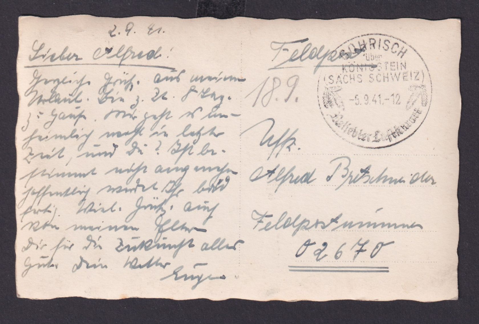 Feldpost ab Gohrisch 05.09.1941