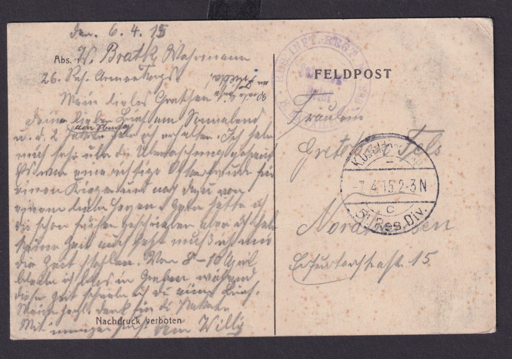 Feldpost nach Nordhausen Thüringen 07.04.1915