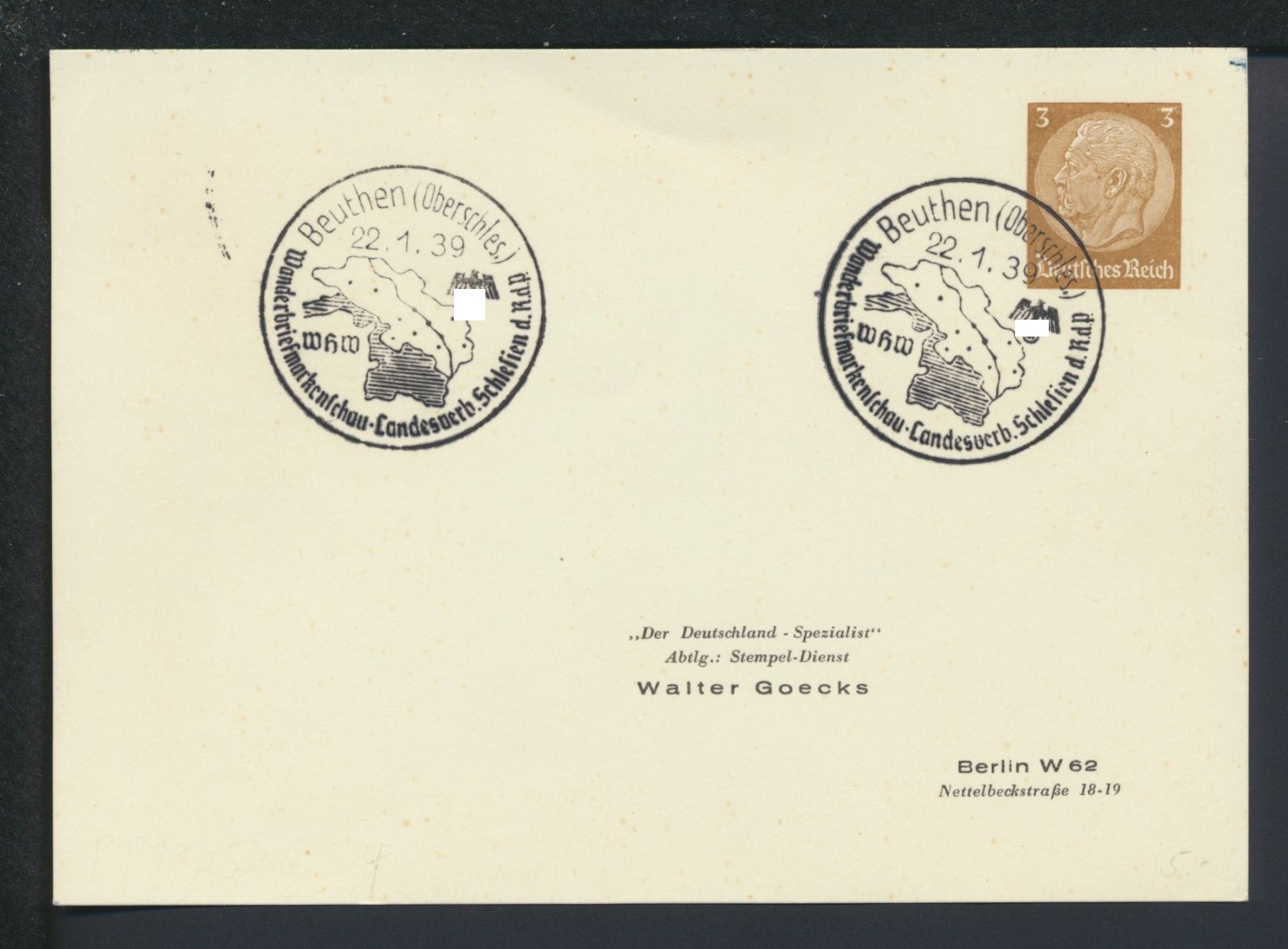 Philatelie WHW Wanderbriefmarkenschau Landesverband Schlesien 22.1.1939 nach Berlin. Landkarte Kartographie ehemalige Ostgebiete.