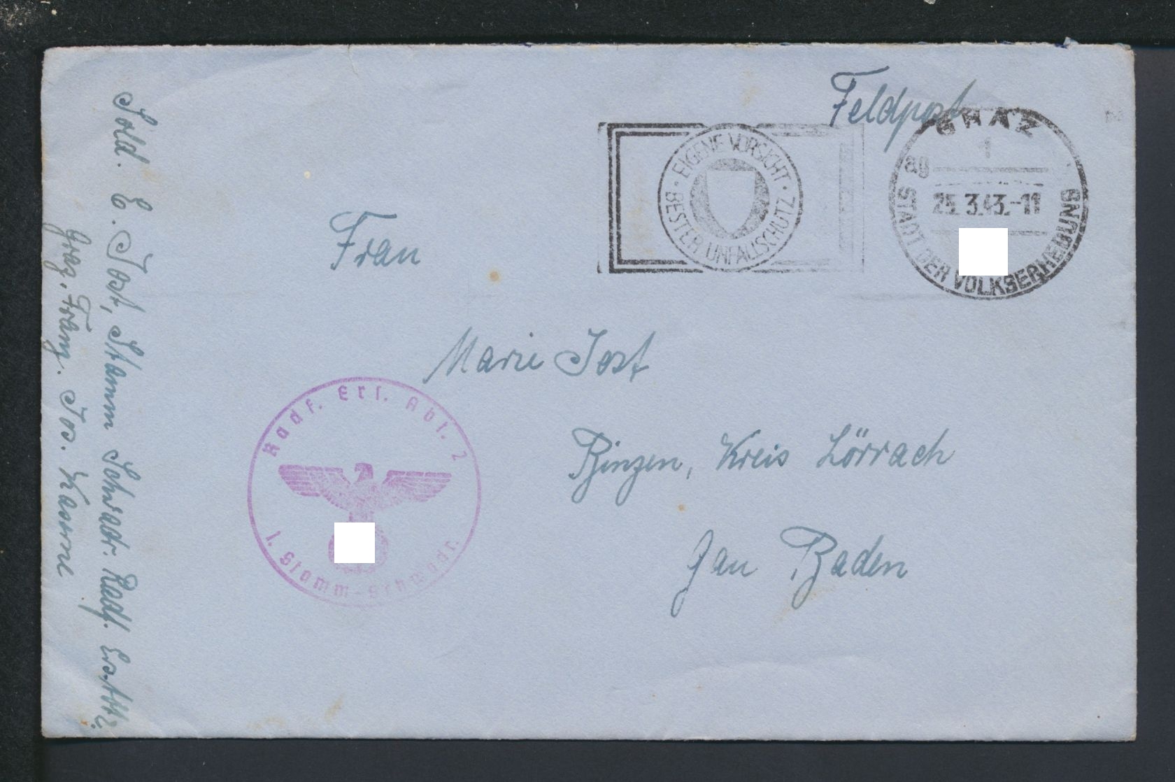 Brief Österreich Graz Propagnada Stempel Stadt der Volkserhebung Feldpost Lörrach