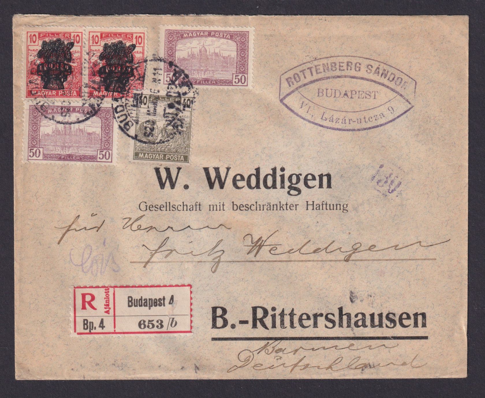 Briefmarken Ungarn R Brief Budapest Wuppertal Barmen Rittershausen 26.3.1920