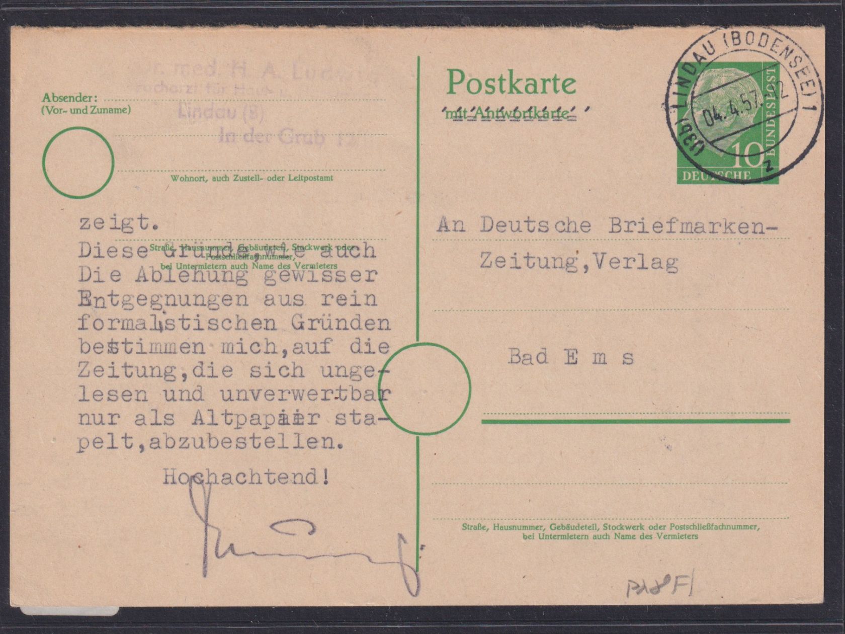 Bund Ganzsache P 28 F Lindau Bodensee nach Bad Ems