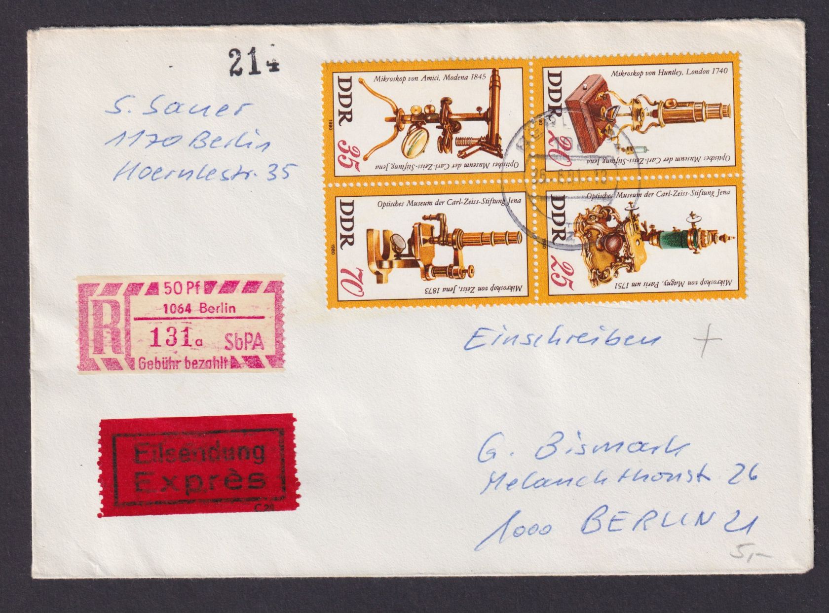 DDR Besonderheit Eilboten R Brief Einschreibemarke 50 Pfg. Viererblock Berlin