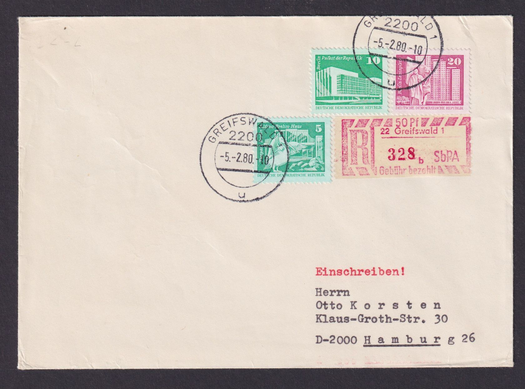 DDR R Brief MIF Aufbau plus Einschreibemarke 50 Pfg. Gebühr bezahlt Greifswald