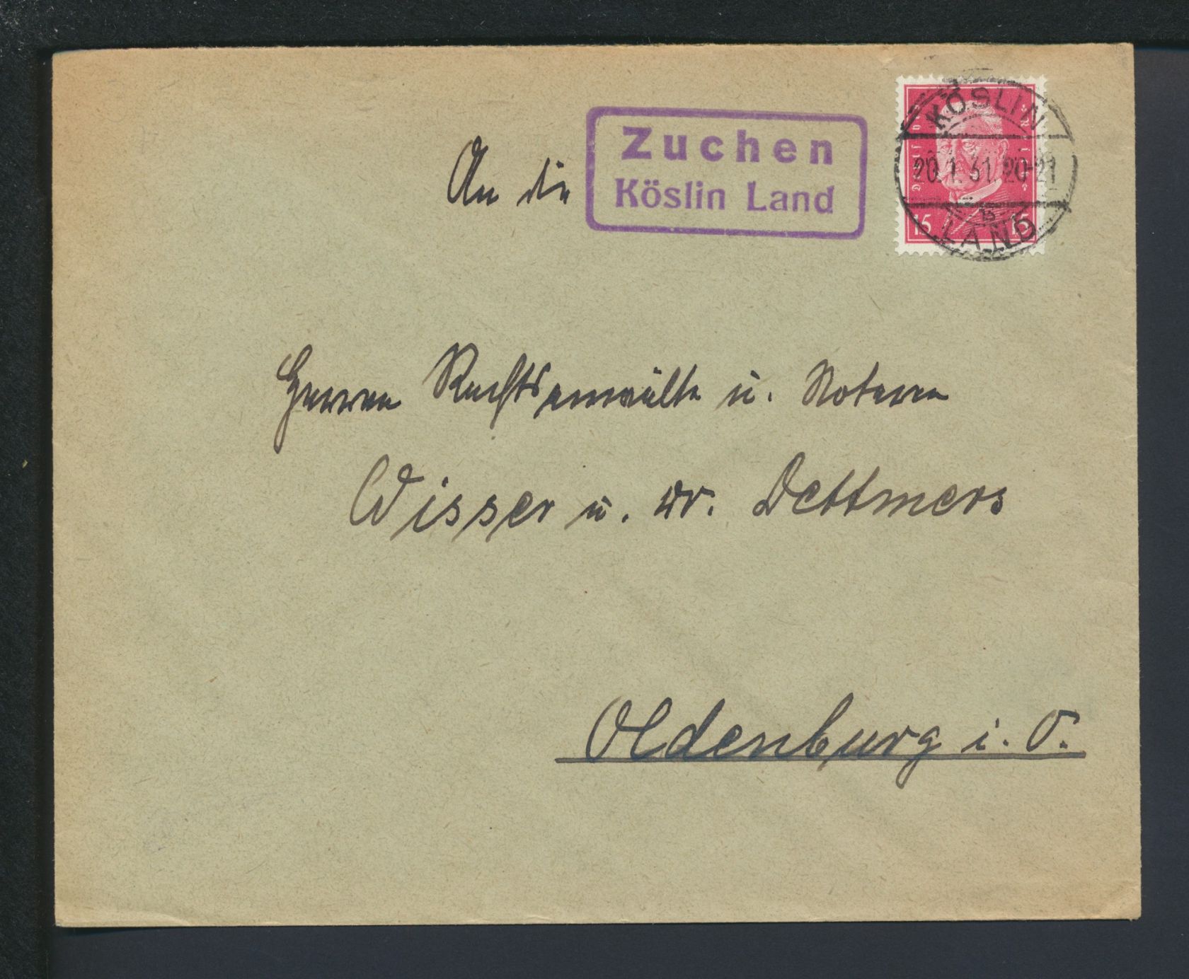 Deutsches Reich Zuchen über Köslin Pommern Ostgebiete Polen Landpoststempel