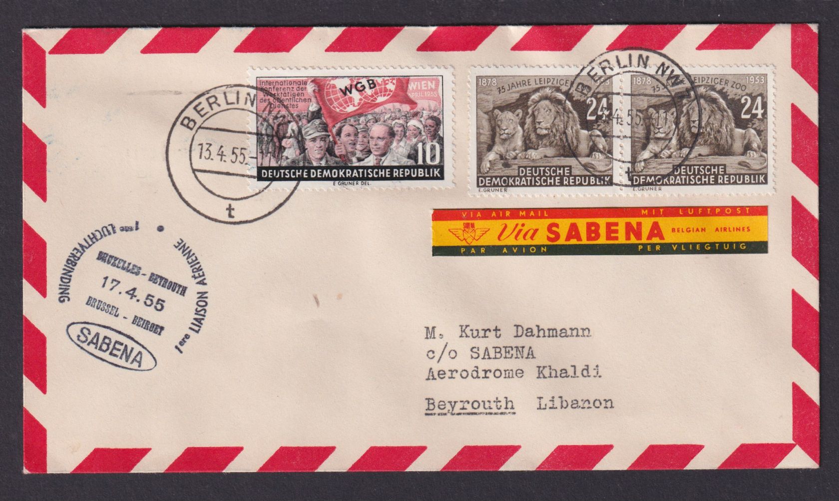 Flugpost Brief Air Mail DDR Berlin Brüssel Belgien Beirut Libanon 1955