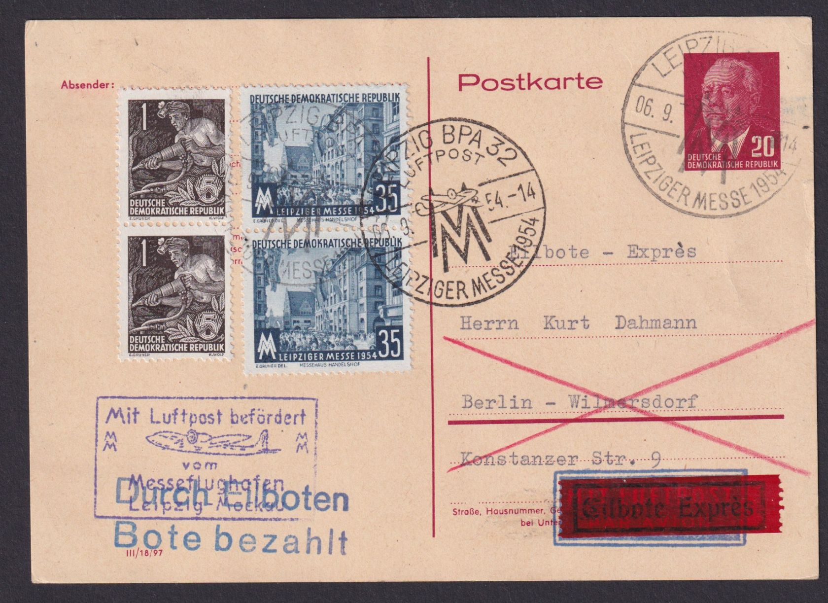 nach Berlin Wilmersdorf 6.9.1954. Sehr schöner Messestempel mit Flugzeug.