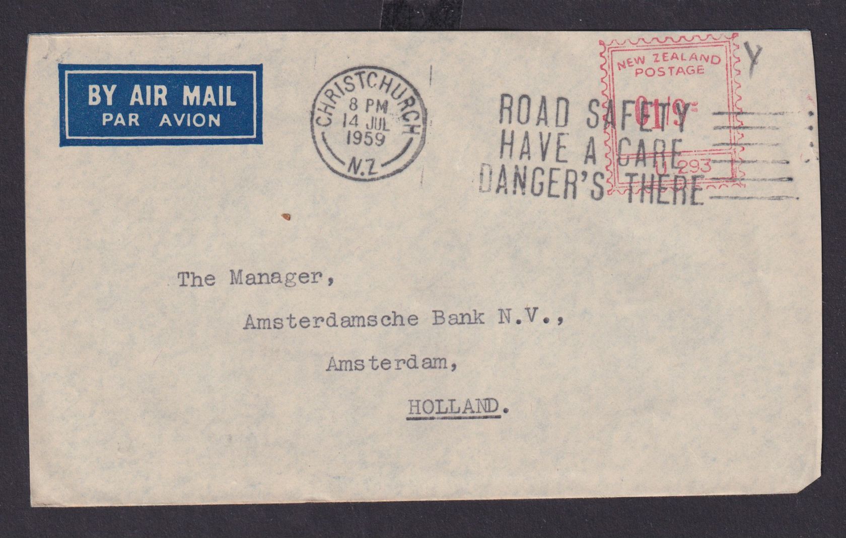 Flugpost Brief Neuseelnad ASF Absenderfreistempel Christchurch Amsterdam