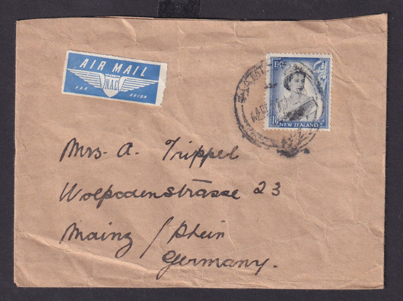 Flugpost Neuseeland Brief EF 1,6 Shilling Queen Elisabeth nach Mainz