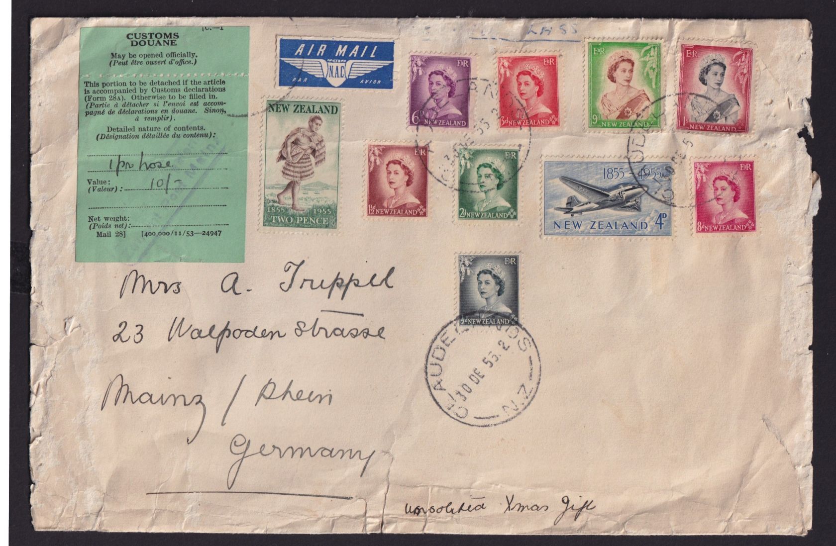 Flugpost Neuseeland Zoll Brief MIF Destiantion Claudelands Hamilton nach Mainz