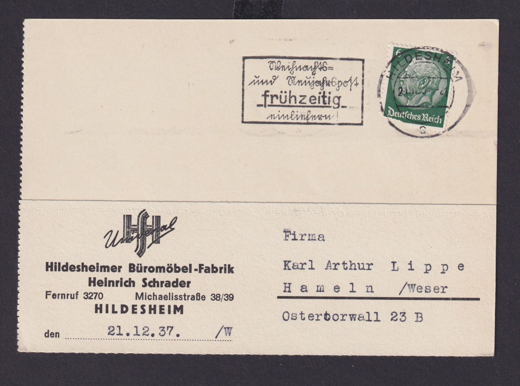 Weihnachts und Neujahrspost frühzeitig einliefern n. Hameln 21.12.1937 Abs. Hildesheimer Büromöbel Fabrik Heinrich Schrader
