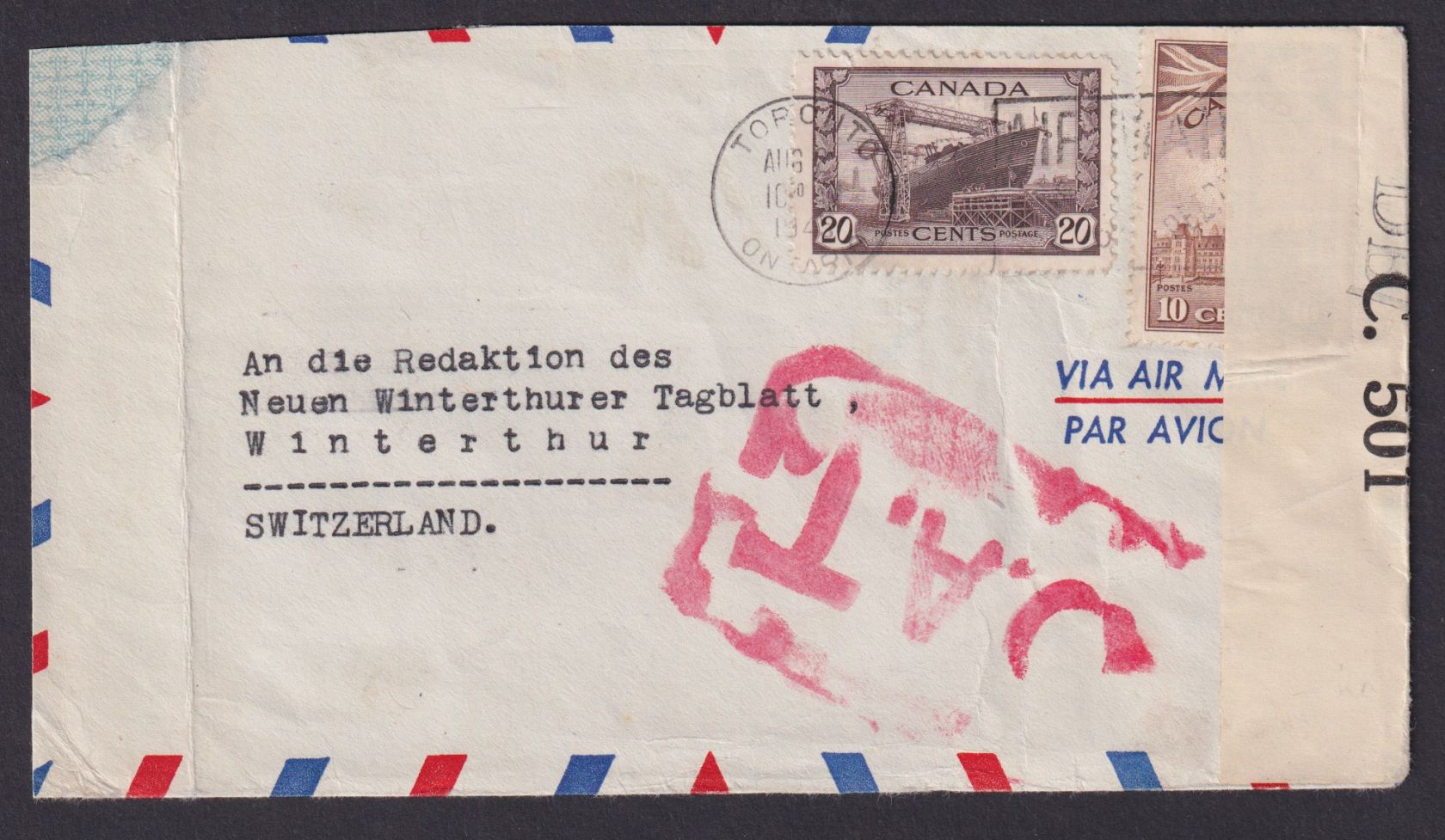 Kanada Zensur Brief Toronto Ontario nach Winterthur August 1945