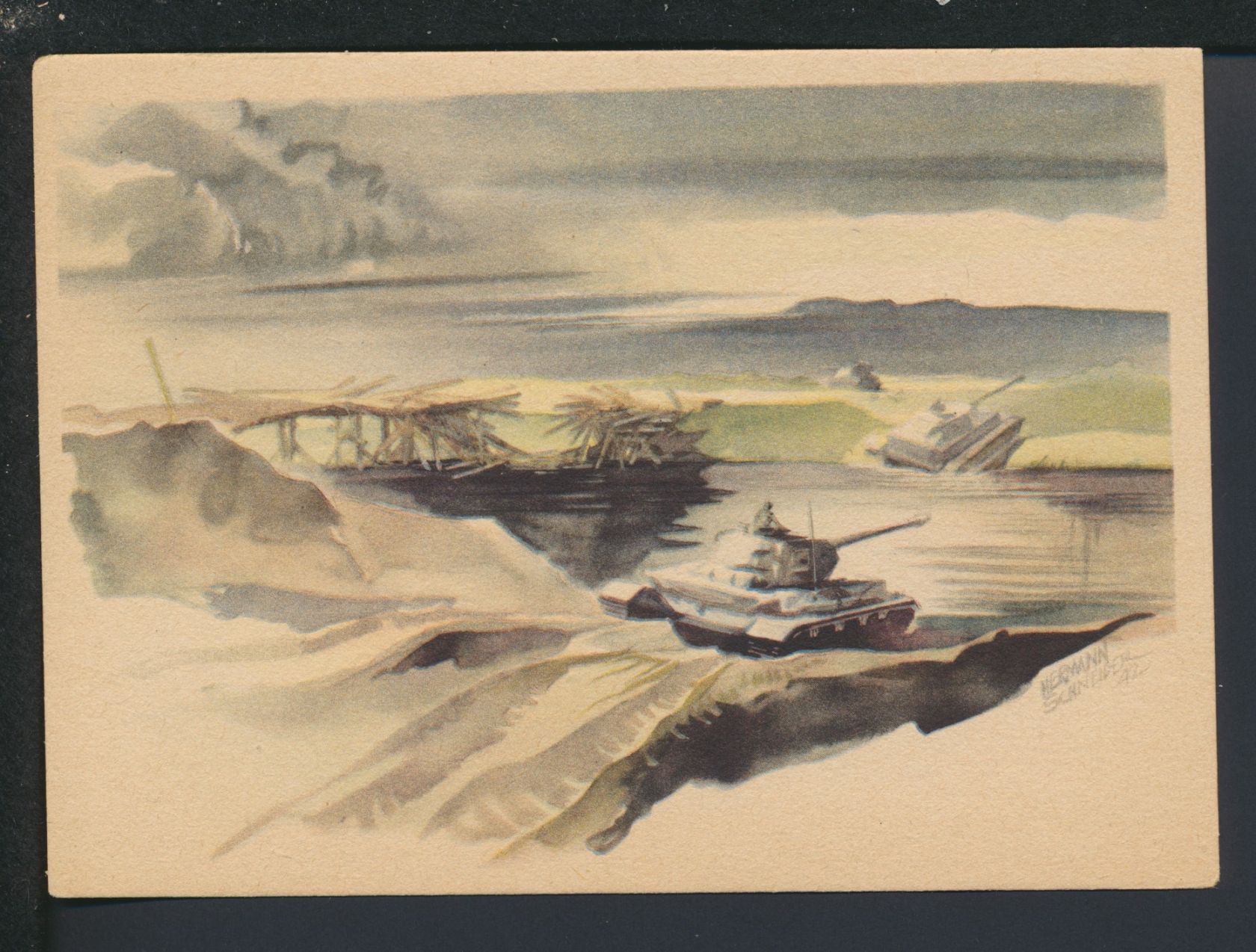 Militaria Künstler Ansichtskarte II WK Panzer Durchqueren die Shisdra Rußland