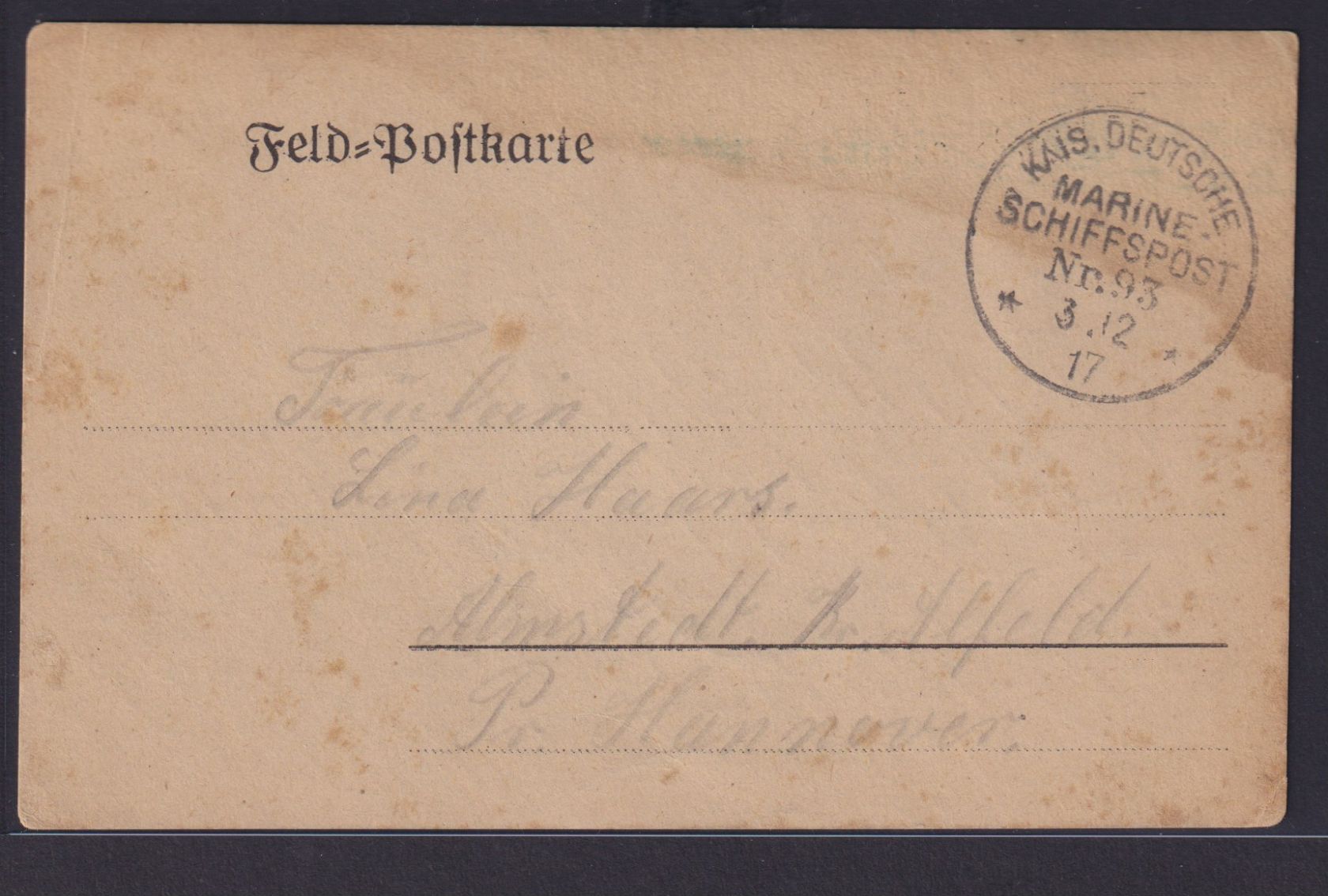 Schiffspost Nr. 93 nach Almstedt 3.12.1917 Schifffahrt