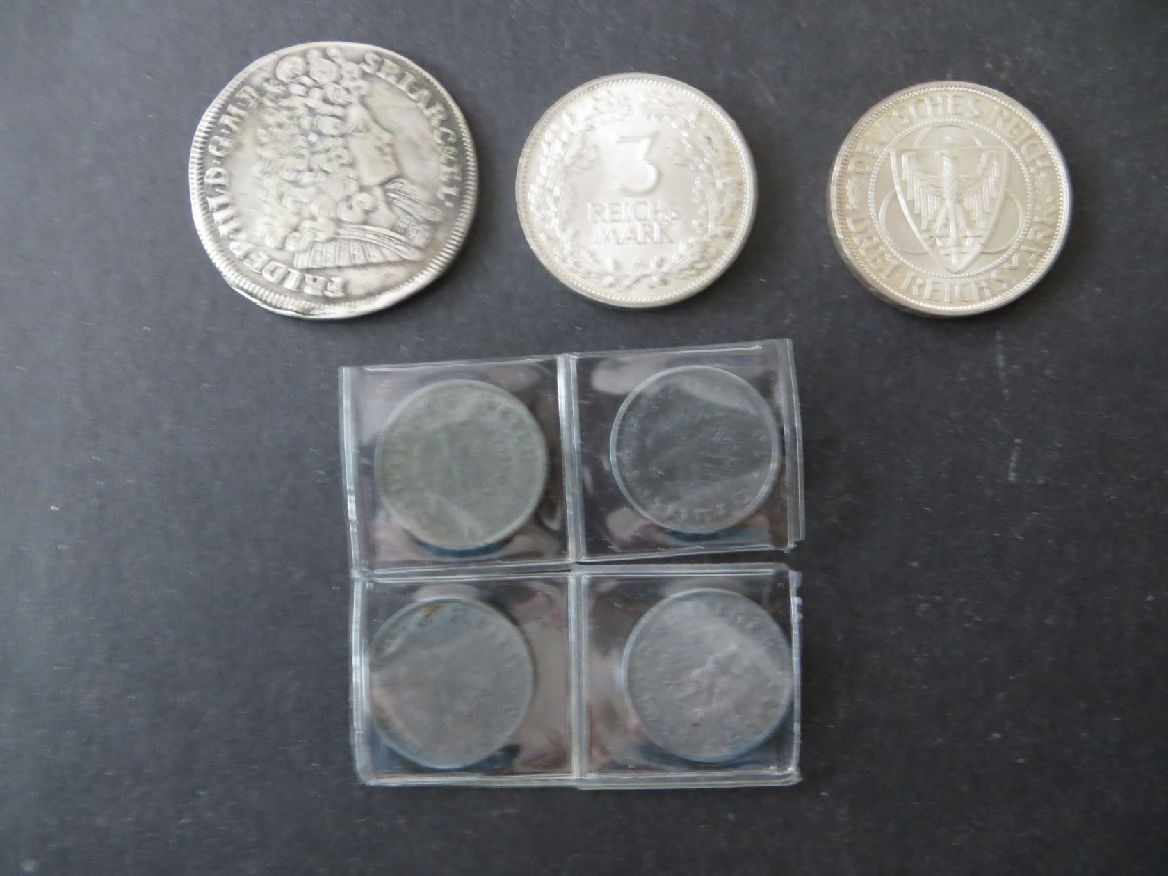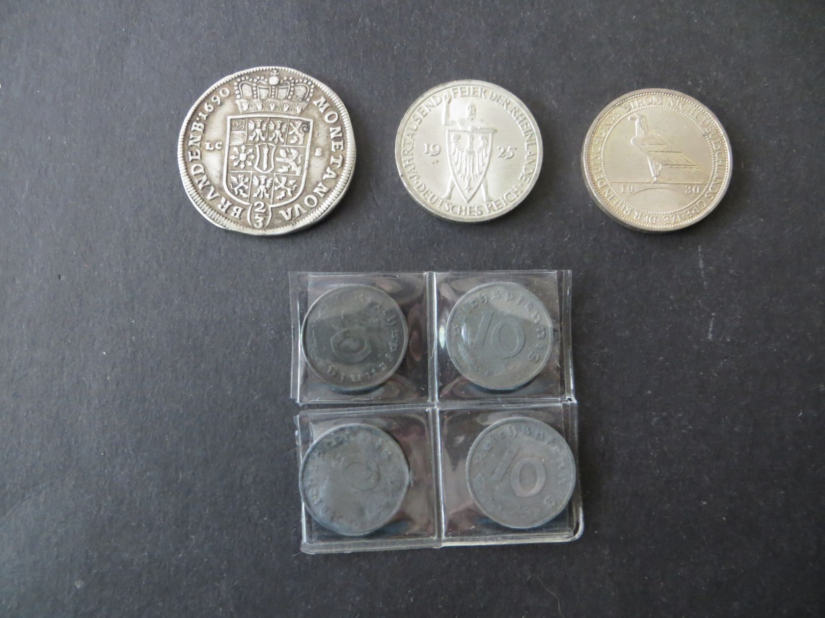 Republik 3 Mark 1925 A 1000 Jahre Rheinland v-st J 321, Weimarer 3 Mark 1930 A Rheinstrom vz-stg. J 345, und Alliierte Besetzung 4x 10 Reichspfennig 1945 F, 1946 F, 1947 F und 1948 A.
