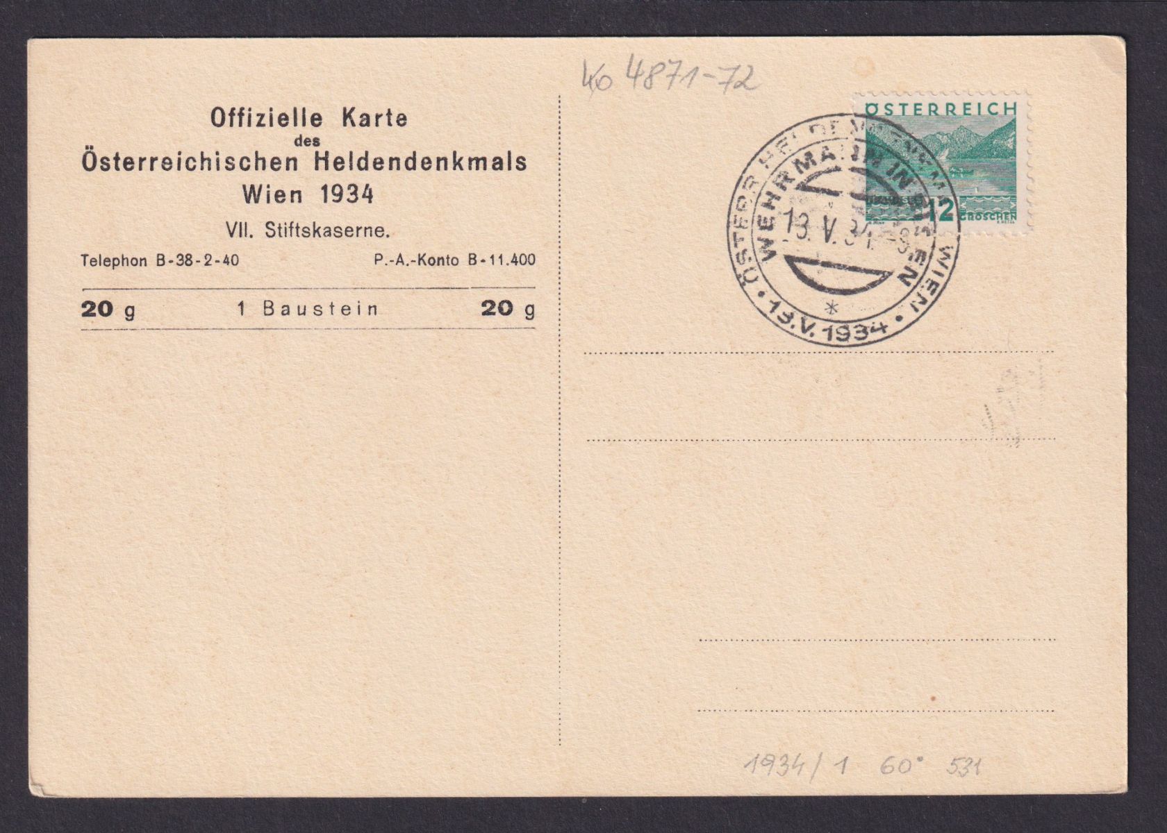 Österreich Kameraden Heldendenkmal Wien 1934 gute Anlasskarte VII Stiftskaserne