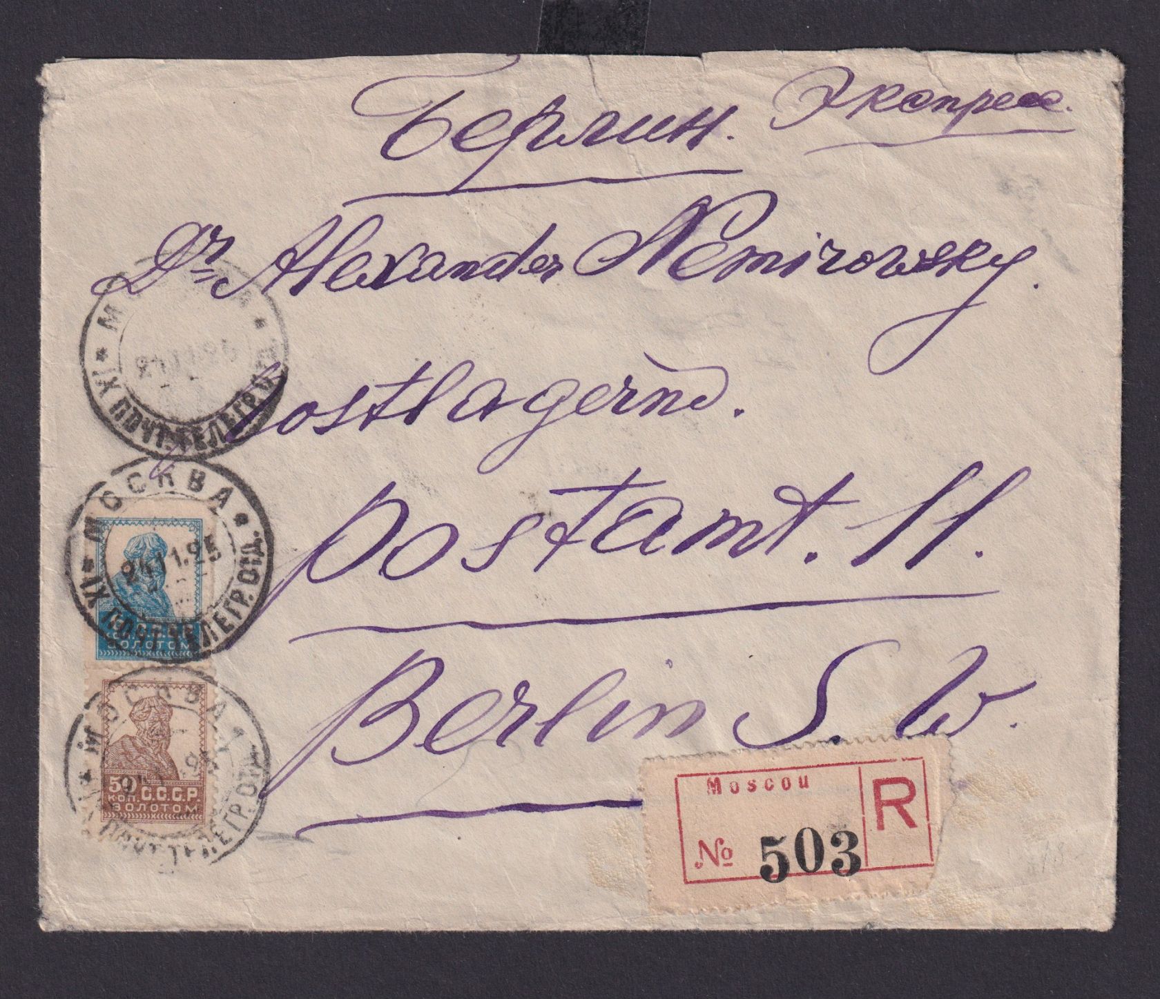 Rußland Sowjetunion Einschreiben Brief Россия Russia MIF 6 + 50 K postlagernd
