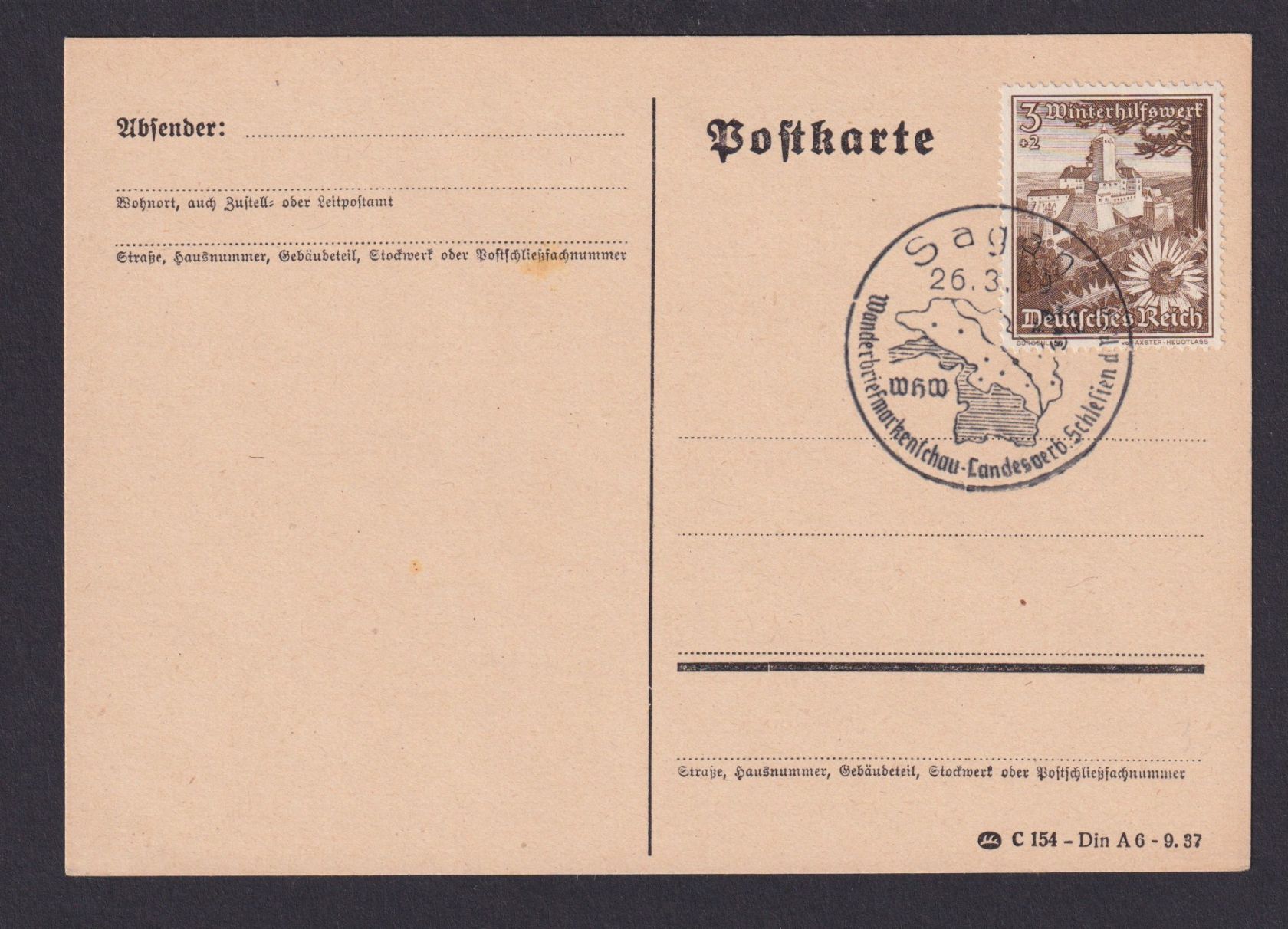 Drittes Reich Karte Philatelie SST Wanderbriefmarkenschau Landesverband Schlesien 26.03.1939 Landkarte Kartographie